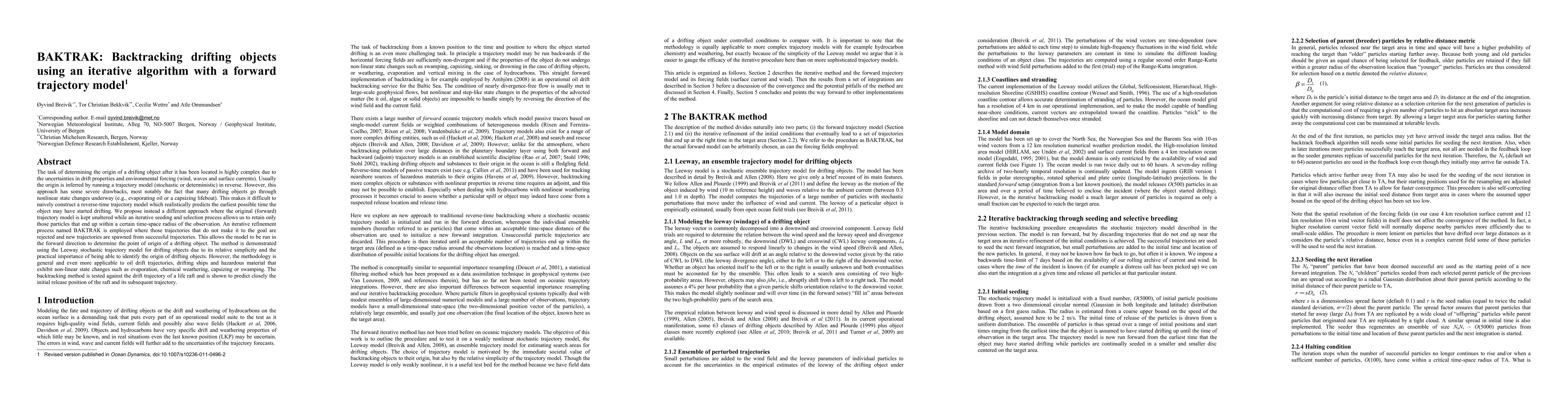 The task of determining the origin of a drifting object after it has been located is highly complex due to the uncertainties in drift properties and environmental forcing (wind, waves and surface currents). Usually the origin is inferred by running a trajectory model (stochastic or deterministic) in reverse. However, this approach has some severe drawbacks, most notably the fact that many drifting objects go through nonlinear state changes underway (e.g., evaporating oil or a capsizing lifeboat). This makes it difficult to naively construct a reverse-time trajectory model which realistically predicts the earliest possible time the object may have started drifting. We propose instead a different approach where the original (forward) trajectory model is kept unaltered while an iterative seeding and selection process allows us to retain only those particles that end up within a certain time-space radius of the observation. An iterative refinement process named BAKTRAK is employed where those trajectories that do not make it to the goal are rejected and new trajectories are spawned from successful trajectories. This allows the model to be run in the forward direction to determine the point of origin of a drifting object. The method is demonstrated using the Leeway stochastic trajectory model for drifting objects due to its relative simplicity and the practical importance of being able to identify the origin of drifting objects. However, the methodology is general and even more applicable to oil drift trajectories, drifting ships and hazardous material that exhibit non-linear state changes such as evaporation, chemical weathering, capsizing or swamping. The backtracking method is tested against the drift trajectory of a life raft and is shown to predict closely the initial release position of the raft and its subsequent trajectory.