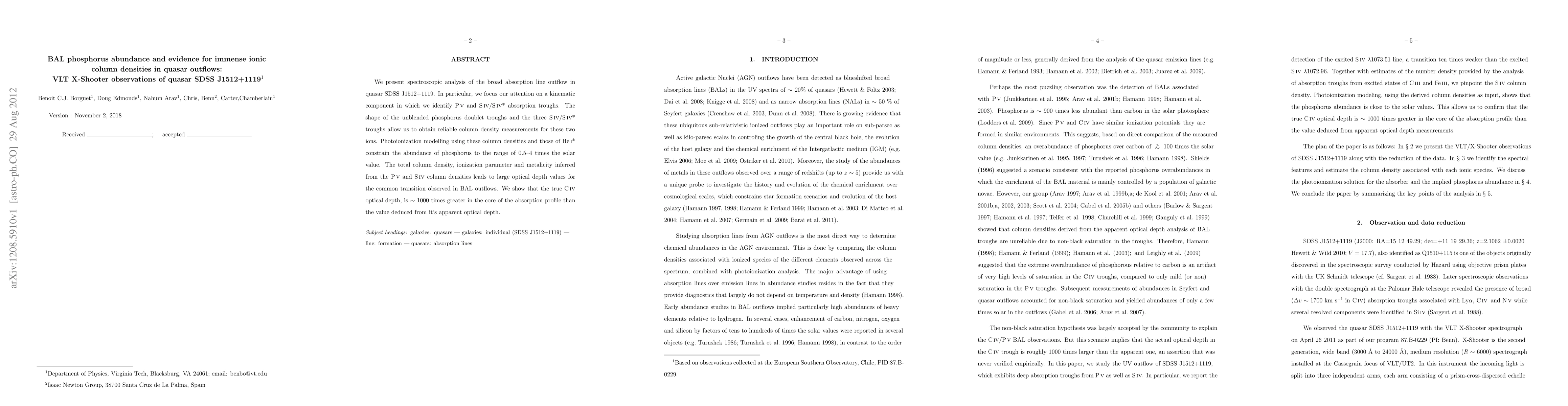 We present spectroscopic analysis of the broad absorption line outflow in quasar SDSS J1512+1119. In particular, we focus our attention on a kinematic component in which we identify PV and SIV/SIV* absorption troughs. The shape of the unblended phosphorus doublet troughs and the three SIV/SIV* troughs allow us to obtain reliable column density measurements for these two ions. Photoionization modelling using these column densities and those of HeI* constrain the abundance of phosphorus to the range of 0.5-4 times the solar value. The total column density, ionization parameter and metalicity inferred from the PV and SIV column densities leads to large optical depth values for the common transition observed in BAL outflows. We show that the true CIV optical depth, is about 1000 times greater in the core of the absorption profile than the value deduced from its apparent optical depth.