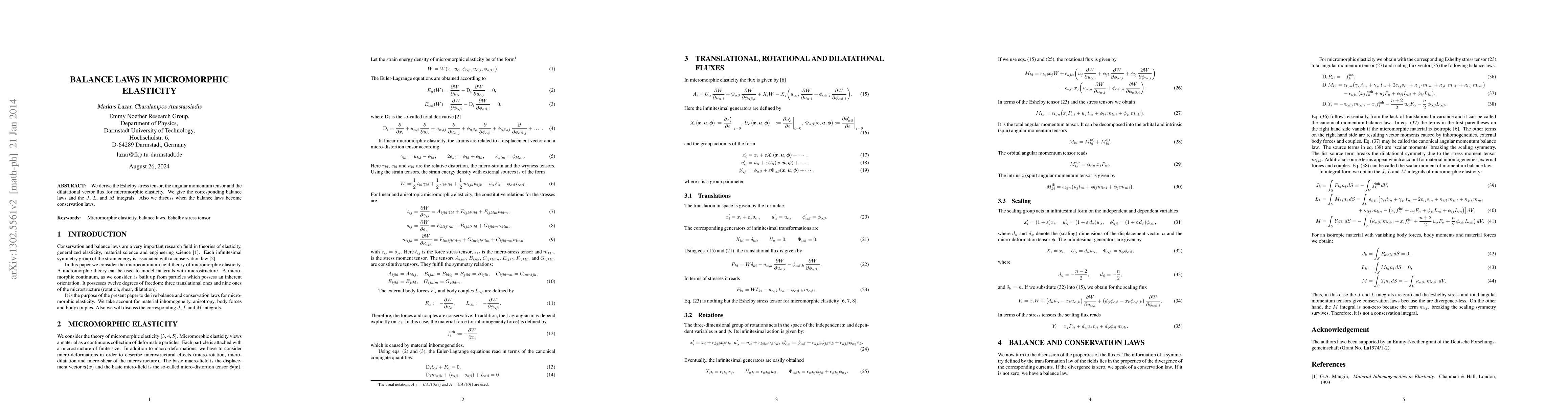 This paper derives fundamental tensors and flux quantities in micromorphic elasticity, including the Eshelby stress tensor, angular momentum tensor, and dilatational vector flux, and presents the associated balance laws and conservation integrals. It also explores conditions under which these balance laws transform into conservation laws.