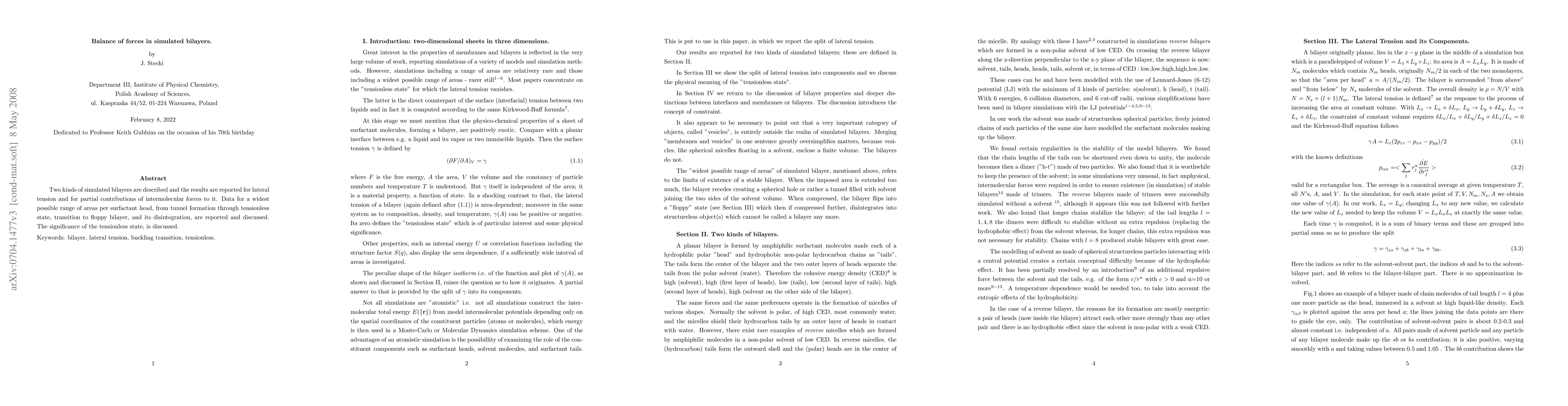 Two kinds of simulated bilayers are described and the results are reported for lateral tension and for partial contributions of intermolecular forces to it.Data for a widest possible range of areas per surfactant head, from tunnel formation through tensionless state, transition to floppy bilayer,to its disintegration, are reported and discussed. The significance of the tensionless state, is discussed. Conclusions: (1) the tensionless state is a coincidence;(2) the transition from extended to floppy bilayer occurs nearby and has hallmarks of a phase transition (3) there is no theory of that transition.(4)The lateral tension of the floppy bilayer scales with size; that of the extended bilayer does not depend on size. (4) The drumhead model not appropriate for interfaces as these fluctuate via diffusion.(5) The radius of gyration also! shows a discontinuity.