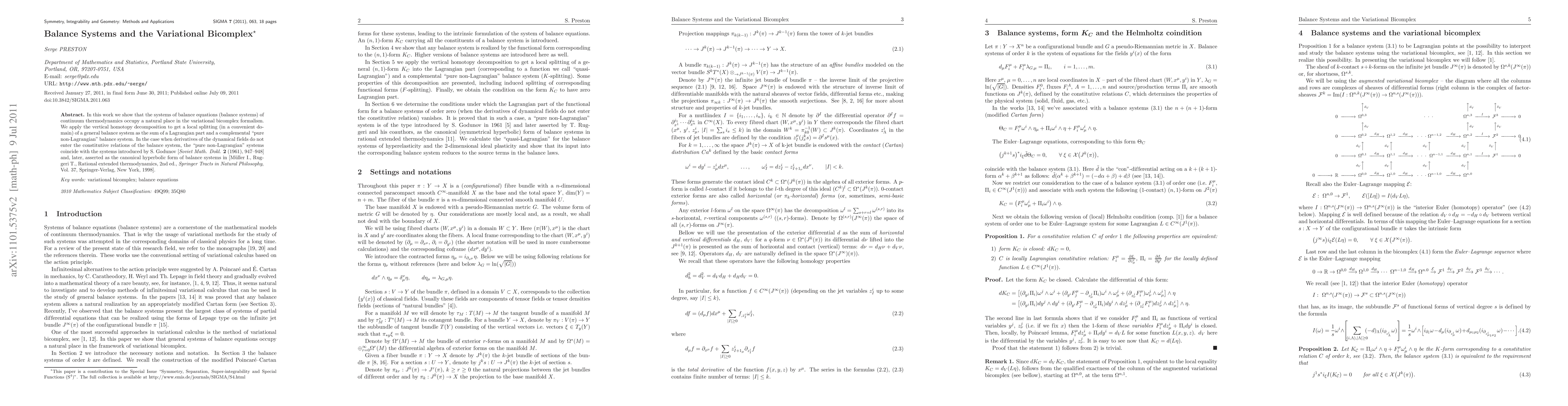 This paper demonstrates the integration of balance systems from continuum thermodynamics into the variational bicomplex framework. It uses vertical homotopy decomposition to decompose balance systems into Lagrangian and "pure non-Lagrangian" components, aligning with canonical hyperbolic forms as seen in Godunov’s work and Müller-Ruggeri’s extended thermodynamics.