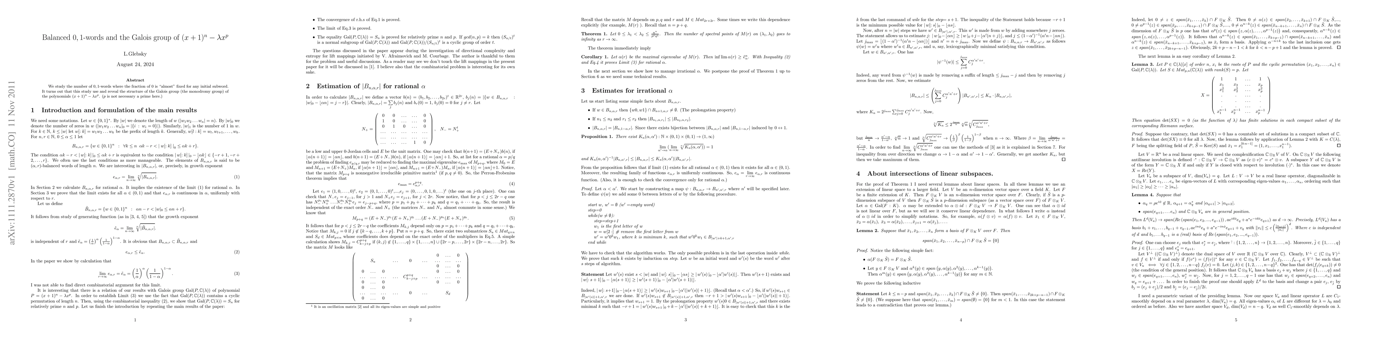 We study the number of $0,1$-words where the fraction of 0 is "almost" fixed for any initial subword. It turns out that this study use and reveal the structure of the Galois group (the monodromy group) of the polynomials $(x+1)^n-\lambda x^p$. ($p$ is not necessary a prime here.)