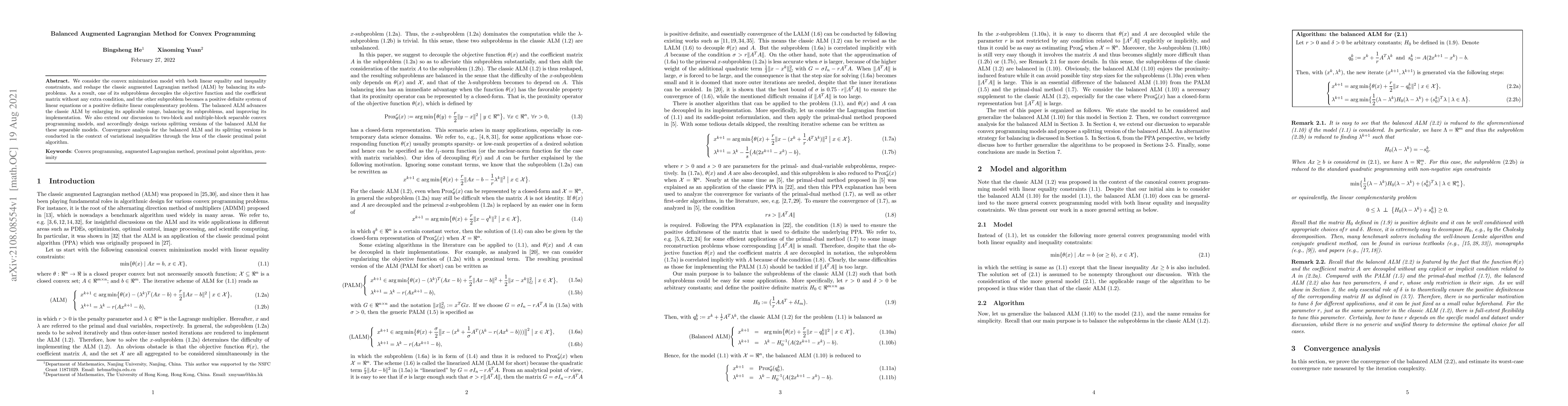 This paper proposes a balanced augmented Lagrangian method (ALM) for convex programming, enhancing the classic ALM by balancing its subproblems and extending its applicability. It achieves decoupling of the objective function and coefficient matrix, and designs splitting versions for separable convex programming models, with convergence analysis based on variational inequalities.