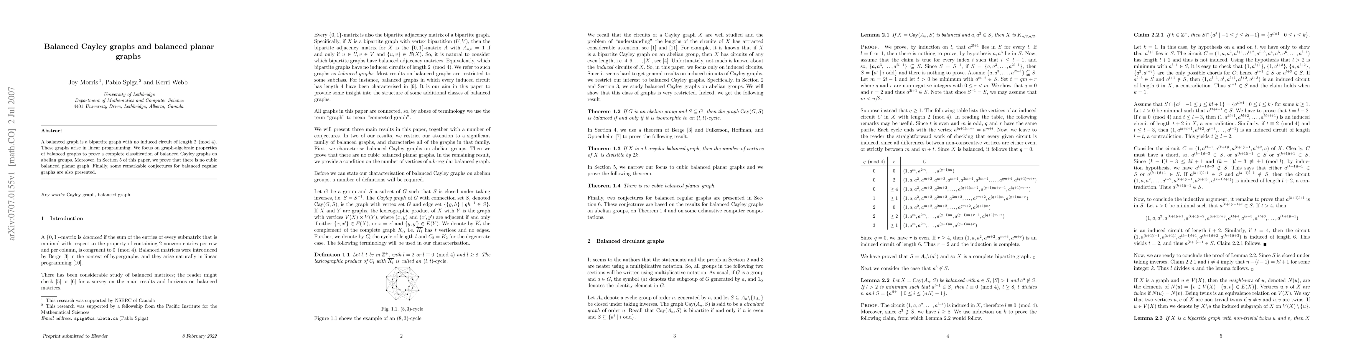 A balanced graph is a bipartite graph with no induced circuit of length 2 mod 4. These graphs arise in linear programming. We focus on graph-algebraic properties of balanced graphs to prove a complete classification of balanced Cayley graphs on abelian groups. Moreover, in Section 5 of this paper, we prove that there is no cubic balanced planar graph. Finally, some remarkable conjectures for balanced regular graphs are also presented.