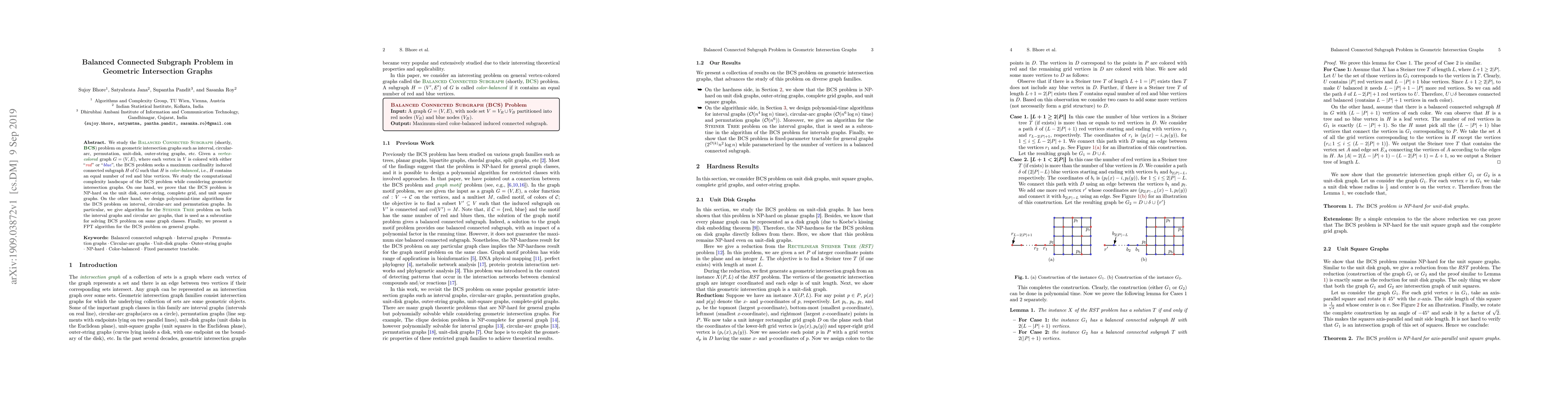 This paper explores the computational complexity of the Balanced Connected Subgraph (BCS) problem on various geometric intersection graphs, proving it to be NP-hard on unit disk, outer-string, complete grid, and unit square graphs while providing polynomial-time algorithms for interval, circular-arc, and permutation graphs, including specialized Steiner Tree algorithms.