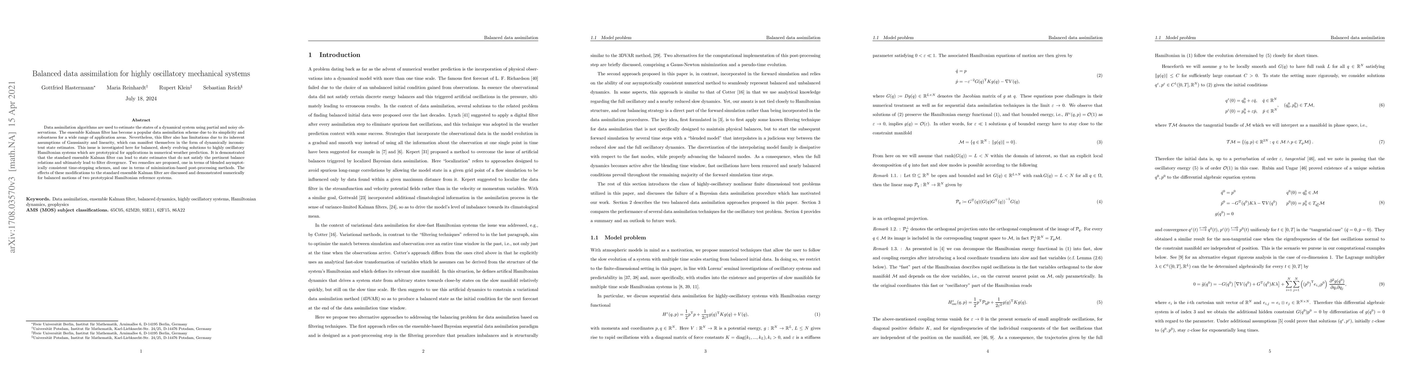 This paper addresses the limitations of the ensemble Kalman filter for highly oscillatory Hamiltonian systems, showing that standard methods can lead to dynamically inconsistent state estimates and filter divergence. It proposes blended time-stepping schemes and ensemble-based penalty methods to remedy these issues, demonstrating their effectiveness through numerical simulations in meteorological and molecular dynamics applications.