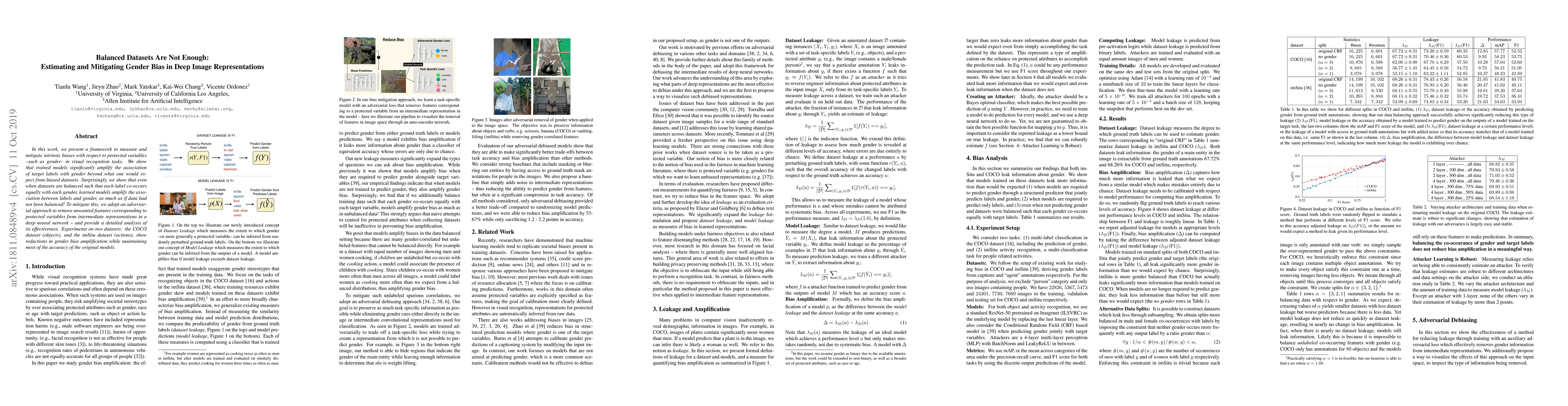 In this work, we present a framework to measure and mitigate intrinsic biases with respect to protected variables --such as gender-- in visual recognition tasks. We show that trained models significantly amplify the association of target labels with gender beyond what one would expect from biased datasets. Surprisingly, we show that even when datasets are balanced such that each label co-occurs equally with each gender, learned models amplify the association between labels and gender, as much as if data had not been balanced! To mitigate this, we adopt an adversarial approach to remove unwanted features corresponding to protected variables from intermediate representations in a deep neural network -- and provide a detailed analysis of its effectiveness. Experiments on two datasets: the COCO dataset (objects), and the imSitu dataset (actions), show reductions in gender bias amplification while maintaining most of the accuracy of the original models.