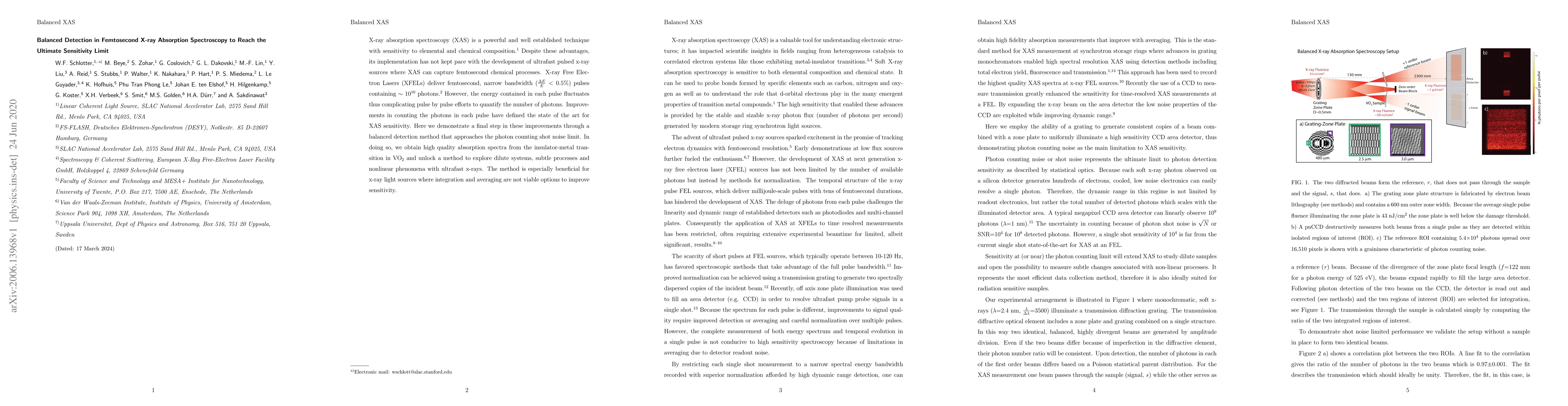 X-ray absorption spectroscopy (XAS) is a powerful and well established technique with sensitivity to elemental and chemical composition. Despite these advantages, its implementation has not kept pace with the development of ultrafast pulsed x-ray sources where XAS can capture femtosecond chemical processes. X-ray Free Electron Lasers (XFELs) deliver femtosecond, narrow bandwidth ($\frac{\Delta E}{E} < 0.5\%$) pulses containing $\sim 10^{10}$ photons. However, the energy contained in each pulse fluctuates thus complicating pulse by pulse efforts to quantify the number of photons. Improvements in counting the photons in each pulse have defined the state of the art for XAS sensitivity. Here we demonstrate a final step in these improvements through a balanced detection method that approaches the photon counting shot noise limit. In doing so, we obtain high quality absorption spectra from the insulator-metal transition in VO$_2$ and unlock a method to explore dilute systems, subtle processes and nonlinear phenomena with ultrafast x-rays. The method is especially beneficial for x-ray light sources where integration and averaging are not viable options to improve sensitivity.
