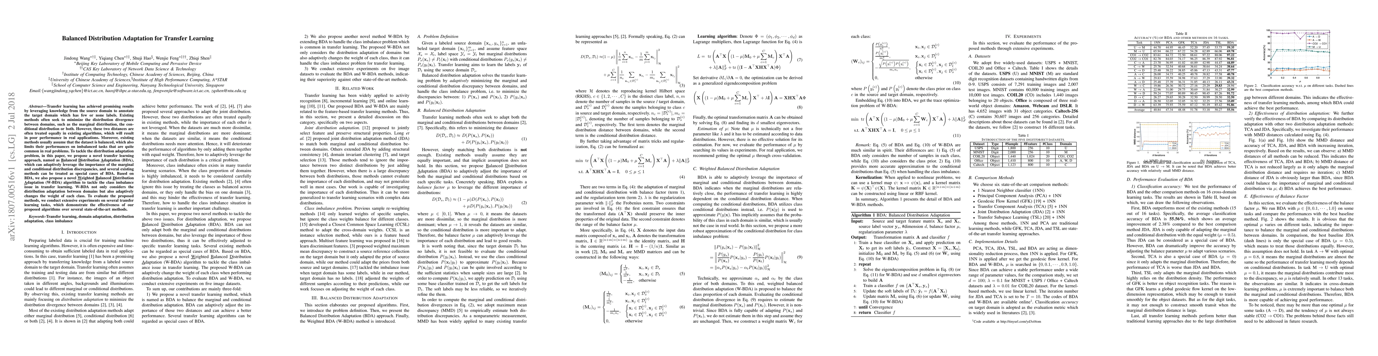 This paper introduces Balanced Distribution Adaptation (BDA) for transfer learning, addressing the imbalanced dataset issue by adaptively leveraging marginal and conditional distribution discrepancies. It further proposes Weighted Balanced Distribution Adaptation (W-BDA) to tackle class imbalance, demonstrating superior performance over state-of-the-art methods in extensive experiments.