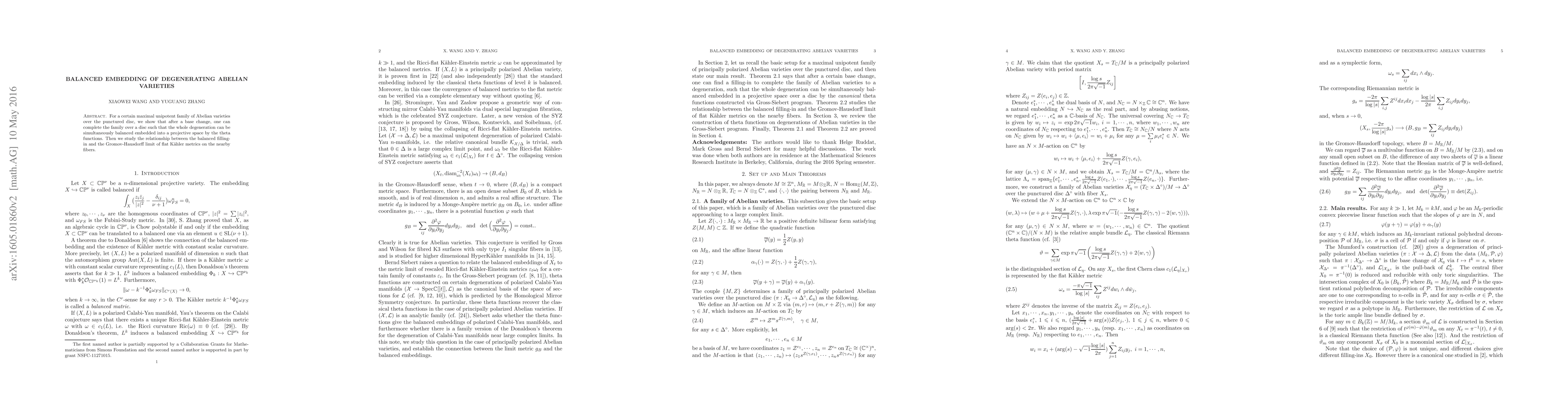 This paper demonstrates how a maximal unipotent family of Abelian varieties over a punctured disc can be completed over a disc, allowing for a balanced embedding into projective space via theta functions. It further explores the connection between this balanced embedding and the Gromov-Hausdorff limit of flat Kähler metrics on nearby fibers.