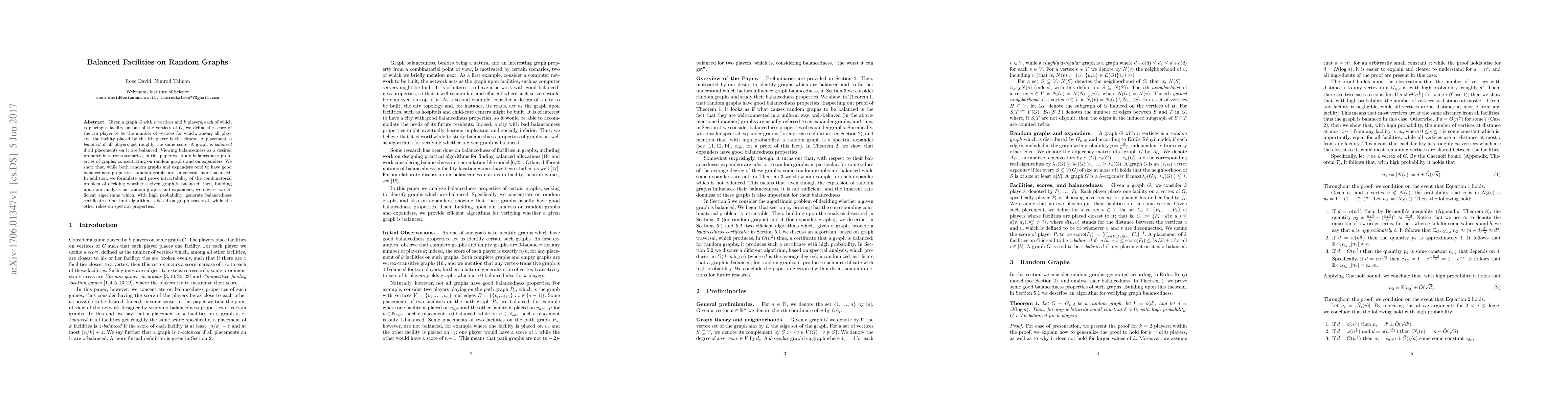 Given a graph G with n vertices and k players, each of which is placing a facility on one of the vertices of G, we define the score of the i'th player to be the number of vertices for which, among all players, the facility placed by the i'th player is the closest. A placement is balanced if all players get roughly the same score. A graph is balanced if all placements on it are balanced. Viewing balancedness as a desired property in various scenarios, in this paper we study balancedness properties of graphs, concentrating on random graphs and on expanders. We show that, while both random graphs and expanders tend to have good balancedness properties, random graphs are, in general, more balanced. In addition, we formulate and prove intractability of the combinatorial problem of deciding whether a given graph is balanced; then, building upon our analysis on random graphs and expanders, we devise two efficient algorithms which, with high probability, generate balancedness certificates. Our first algorithm is based on graph traversal, while the other relies on spectral properties.
