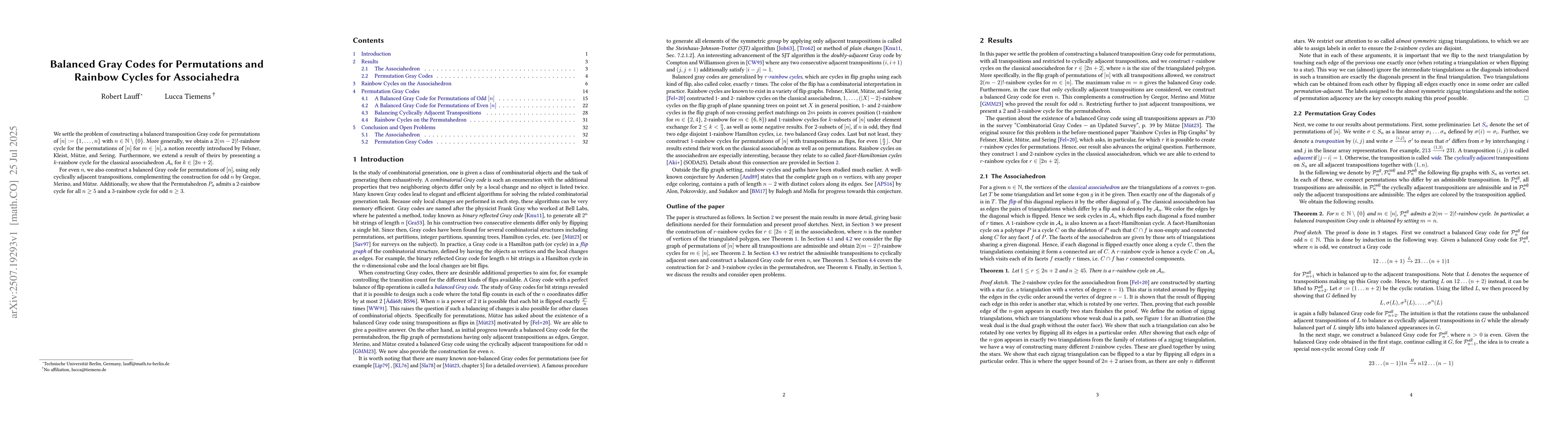 We settle the problem of constructing a balanced transposition Gray code for permutations of $[n] := \{1, \dots, n\}$ with $n \in \mathbb{N}\setminus\{0\}$. More generally, we obtain a~$2(m-2)!$-rainbow cycle for the permutations of $[n]$ for $m \in [n]$, a notion recently introduced by Felsner, Kleist, M\"utze, and Sering. Furthermore, we extend a result of theirs by presenting a $k$-rainbow cycle for the classical associahedron $\mathcal{A}_{n}$ for $k \in [2n + 2]$. For even $n$, we also construct a balanced Gray code for permutations of $[n]$, using only cyclically adjacent transpositions, complementing the construction for odd $n$ by Gregor, Merino, and M\"utze. Additionally, we show that the Permutahedron $P_{n}$ admits a $2$-rainbow cycle for all $n\ge5$ and a $3$-rainbow cycle for odd $n\ge3$.