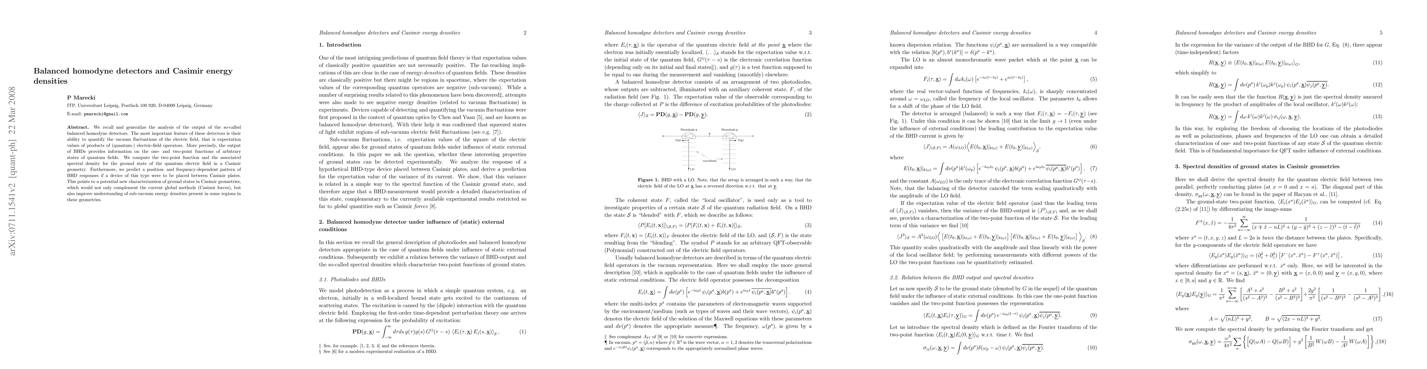 We recall and generalize the analysis of the output of the so-called balanced homodyne detectors. The most important feature of these detectors is their ability to quantify the vacuum fluctuations of the electric field, that is expectation values of products of (quantum-) electric-field operators. More precisely, the output of BHDs provides information on the one- and two-point functions of arbitrary states of quantum fields. We generalize the analysis of the response of BHDs to the case of quantum fields under influence of static external conditions such as cavities or polarizable media. By recalling the expressions for two-point functions of quantum fields in Casimir geometries we show, that a rich, position- and frequency-dependent pattern of BHD responses is predicted for ground states. This points to a potentially new characterization of quantum fields in Casimir setups which would not only complement the current global methods (Casimir forces), but also improve understanding of sub-vacuum energy densities present in some regions in these geometries.