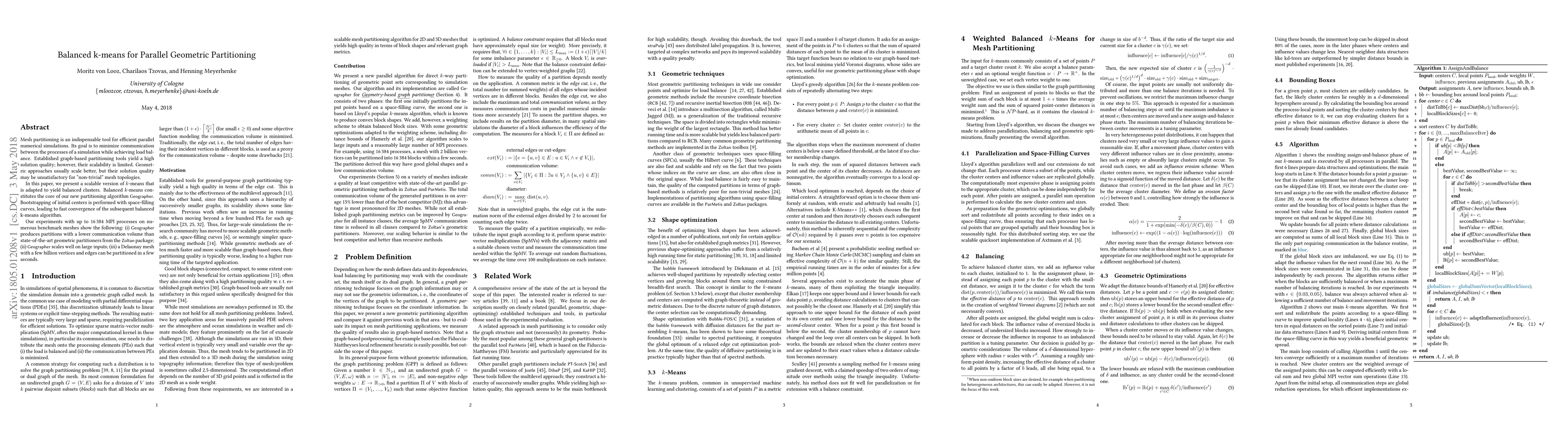 This paper introduces a scalable balanced $k$-means algorithm called Geographer for efficient parallel mesh partitioning, achieving lower communication volume and better scalability compared to existing geometric partitioners, demonstrated through experiments on large meshes.