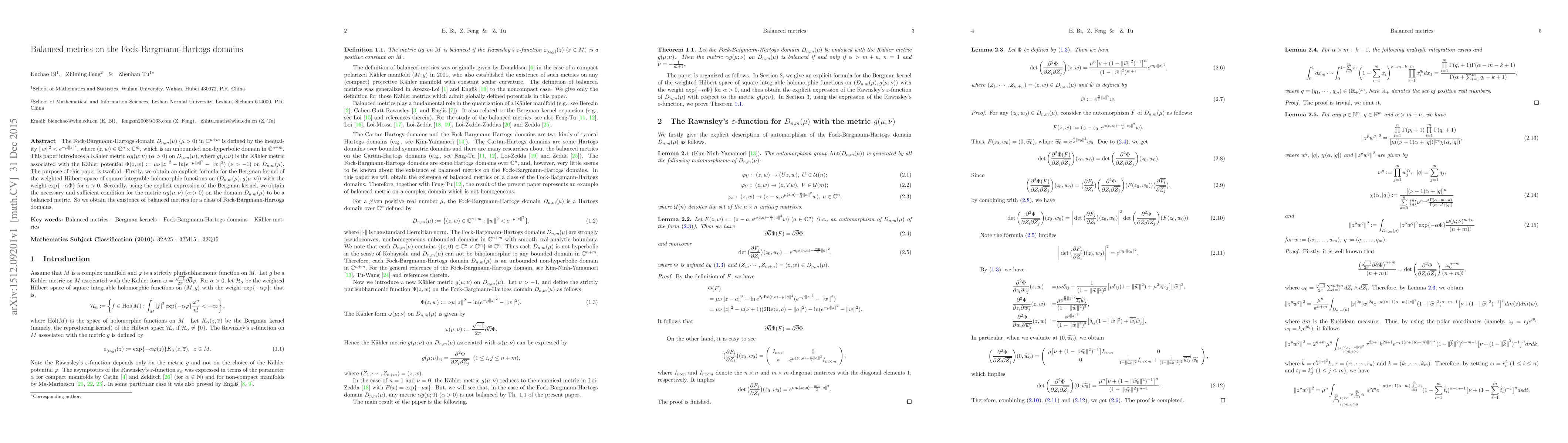 This paper introduces a Kähler metric on the Fock-Bargmann-Hartogs domain $D_{n,m}(\mu)$ and derives an explicit formula for its Bergman kernel. It also establishes the necessary and sufficient conditions for the metric to be balanced, thereby proving the existence of balanced metrics on these domains.