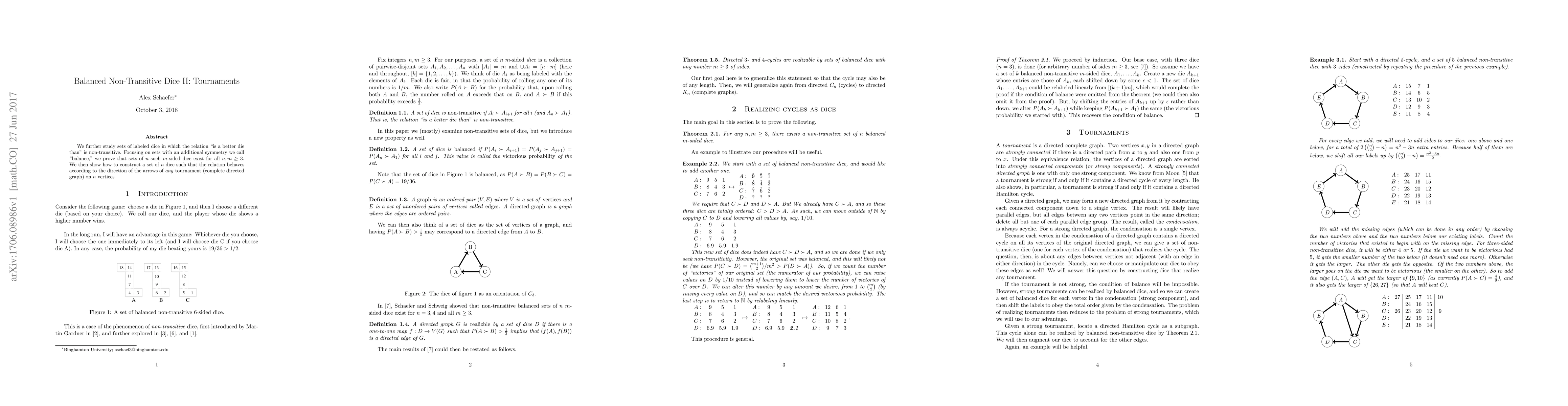 We further study sets of labeled dice in which the relation "is a better die than" is non-transitive. Focusing on sets with an additional symmetry we call "balance," we prove that sets of $n$ such $m$-sided dice exist for all $n,m \geq 3$. We then show how to construct a set of $n$ dice such that the relation behaves according to the direction of the arrows of any tournament (complete directed graph) on $n$ vertices.