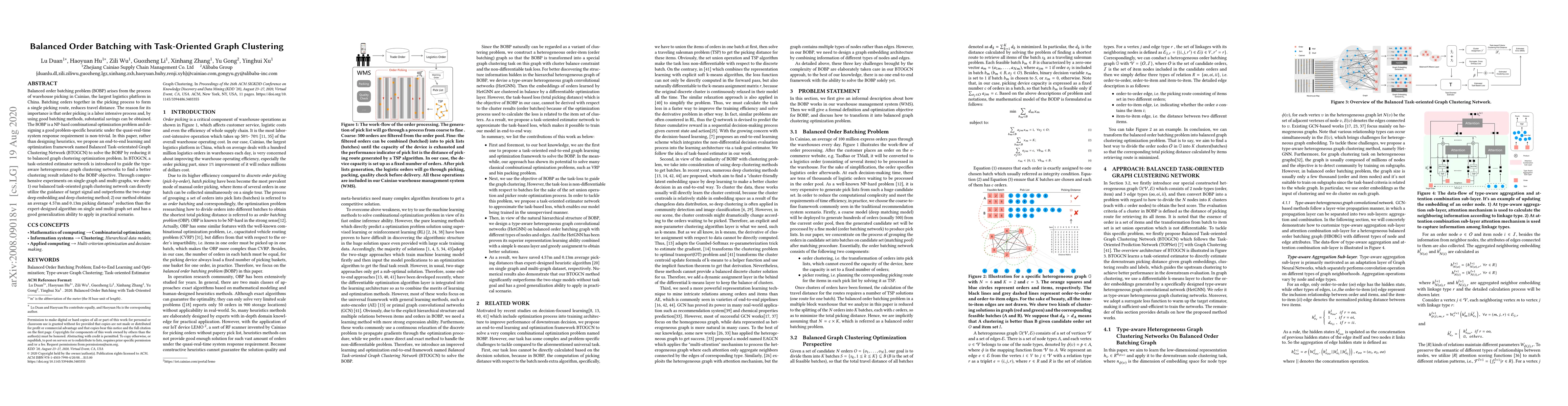 Balanced order batching problem (BOBP) arises from the process of warehouse picking in Cainiao, the largest logistics platform in China. Batching orders together in the picking process to form a single picking route, reduces travel distance. The reason for its importance is that order picking is a labor intensive process and, by using good batching methods, substantial savings can be obtained. The BOBP is a NP-hard combinational optimization problem and designing a good problem-specific heuristic under the quasi-real-time system response requirement is non-trivial. In this paper, rather than designing heuristics, we propose an end-to-end learning and optimization framework named Balanced Task-orientated Graph Clustering Network (BTOGCN) to solve the BOBP by reducing it to balanced graph clustering optimization problem. In BTOGCN, a task-oriented estimator network is introduced to guide the type-aware heterogeneous graph clustering networks to find a better clustering result related to the BOBP objective. Through comprehensive experiments on single-graph and multi-graphs, we show: 1) our balanced task-oriented graph clustering network can directly utilize the guidance of target signal and outperforms the two-stage deep embedding and deep clustering method; 2) our method obtains an average 4.57m and 0.13m picking distance ("m" is the abbreviation of the meter (the SI base unit of length)) reduction than the expert-designed algorithm on single and multi-graph set and has a good generalization ability to apply in practical scenario.