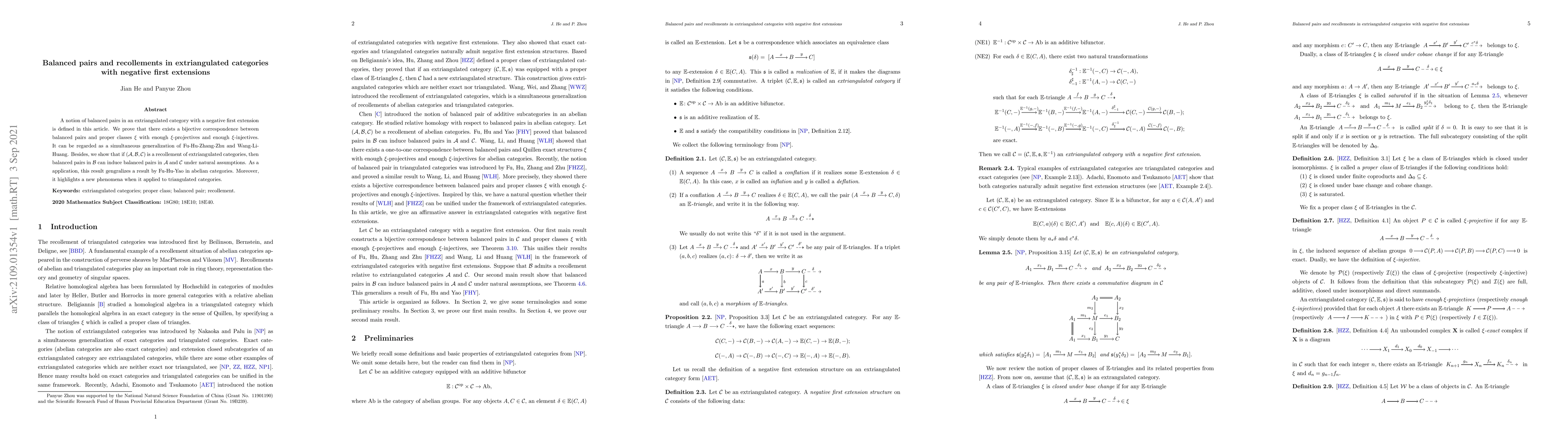 A notion of balanced pairs in an extriangulated category with a negative first extension is defined in this article. We prove that there exists a bijective correspondence between balanced pairs and proper classes $\xi$ with enough $\xi$-projectives and enough $\xi$-injectives. It can be regarded as a simultaneous generalization of Fu-Hu-Zhang-Zhu and Wang-Li-Huang. Besides, we show that if $(\mathcal A ,\mathcal B,\mathcal C)$ is a recollement of extriangulated categories, then balanced pairs in $\mathcal B$ can induce balanced pairs in $\mathcal A$ and $\mathcal C$ under natural assumptions. As a application, this result gengralizes a result by Fu-Hu-Yao in abelian categories. Moreover, it highlights a new phenomena when it applied to triangulated categories.