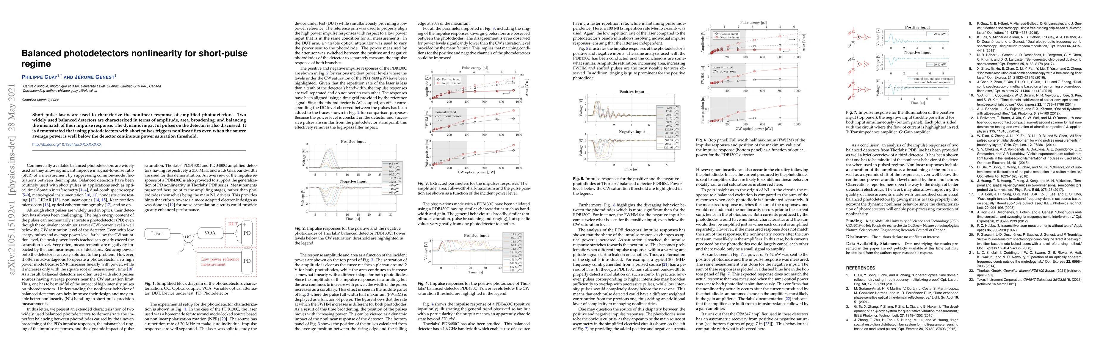 Short pulse lasers are used to characterize the nonlinear response of amplified photodetectors. Two widely used balanced detectors are characterized in terms of amplitude, area, broadening, and balancing the mismatch of their impulse response. The dynamic impact of pulses on the detector is also discussed. It is demonstrated that using photodetectors with short pulses triggers nonlinearities even when the source average power is well below the detector continuous power saturation threshold.