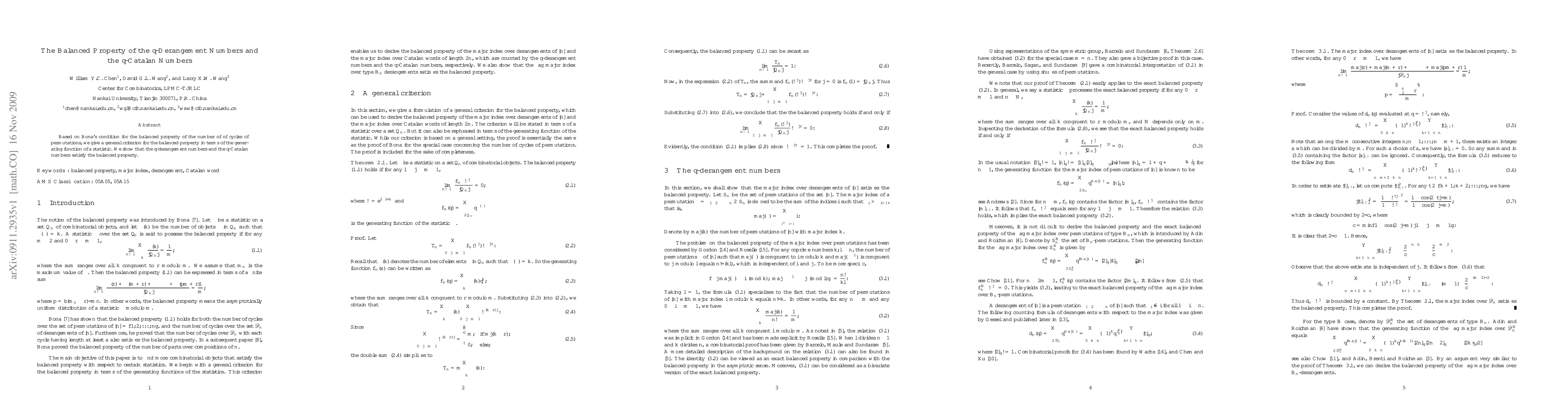 Based on Bona's condition for the balanced property of the number of cycles of permutations, we give a general criterion for the balanced property in terms of the generating function of a statistic. We show that the q-derangement numbers and the q-Catalan numbers satisfy the balanced property.