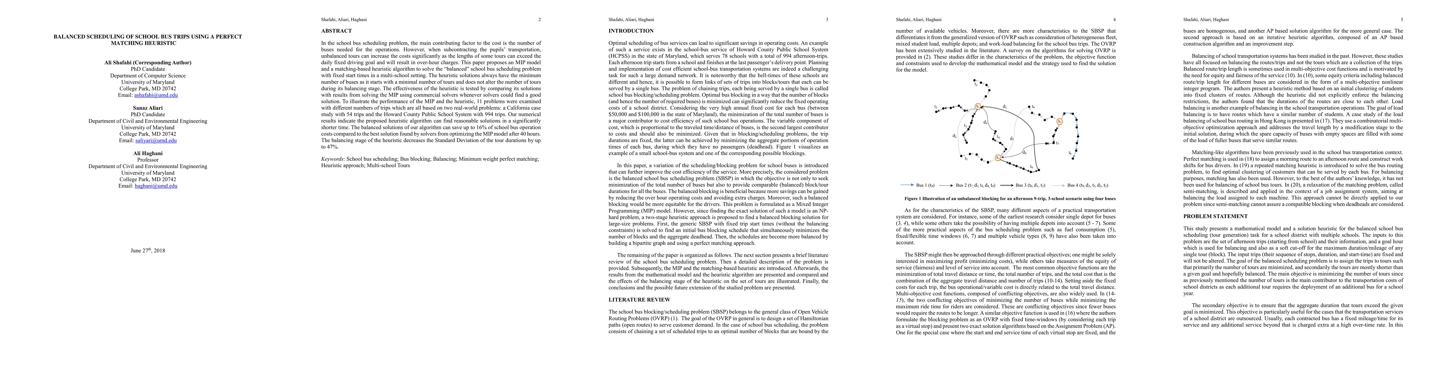 The paper presents a novel two-stage heuristic algorithm that combines an optimal blocking stage with a balancing stage using perfect matching, ensuring minimal bus usage while balancing tour durations.