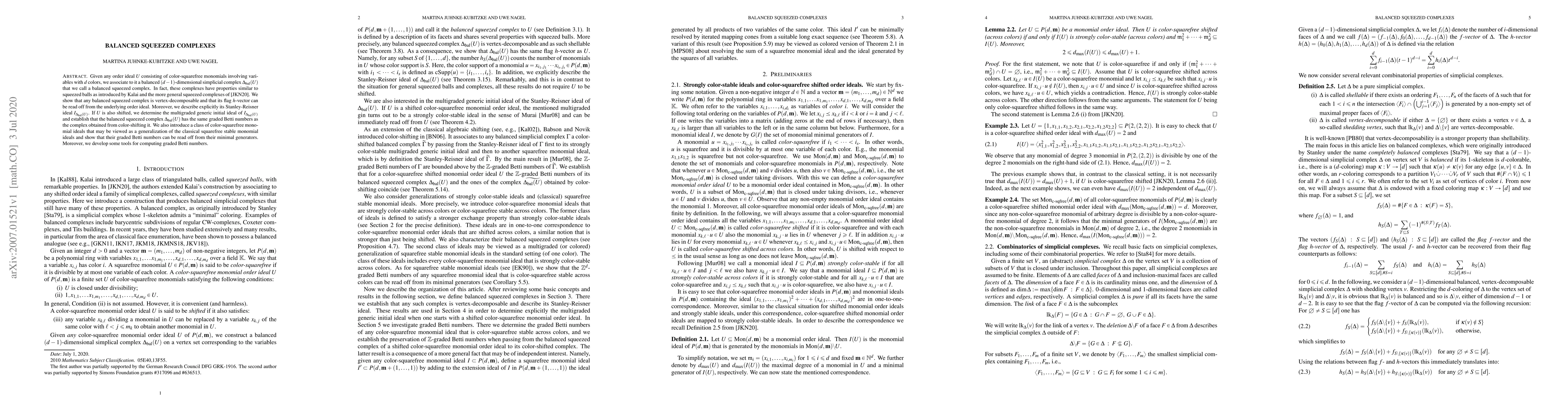 This paper introduces balanced squeezed complexes associated with order ideals of color-squarefree monomials. It demonstrates that these complexes are vertex-decomposable and their flag $h$-vectors are derived from the order ideal. The paper also establishes the graded Betti numbers for shifted complexes and generalizes squarefree stable monomial ideals.