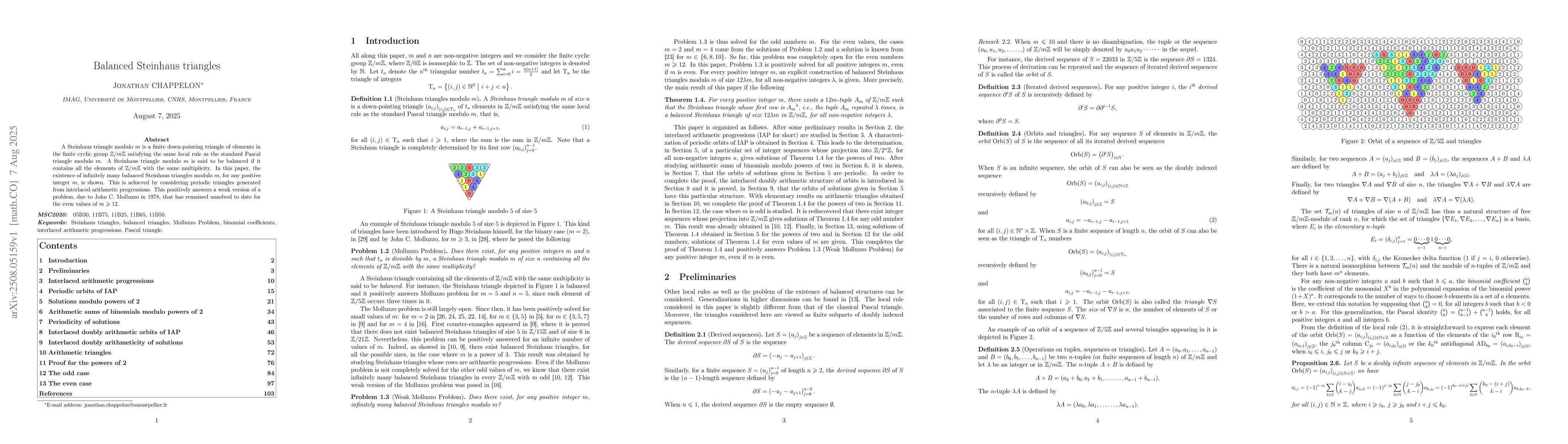 A Steinhaus triangle modulo $m$ is a finite down-pointing triangle of elements in the finite cyclic group $\mathbb{Z}/m\mathbb{Z}$ satisfying the same local rule as the standard Pascal triangle modulo $m$. A Steinhaus triangle modulo $m$ is said to be balanced if it contains all the elements of $\mathbb{Z}/m\mathbb{Z}$ with the same multiplicity. In this paper, the existence of infinitely many balanced Steinhaus triangles modulo $m$, for any positive integer $m$, is shown. This is achieved by considering periodic triangles generated from interlaced arithmetic progressions. This positively answers a weak version of a problem, due to John C. Molluzzo in 1978, that has remained unsolved to date for the even values of $m\geqslant 12$.