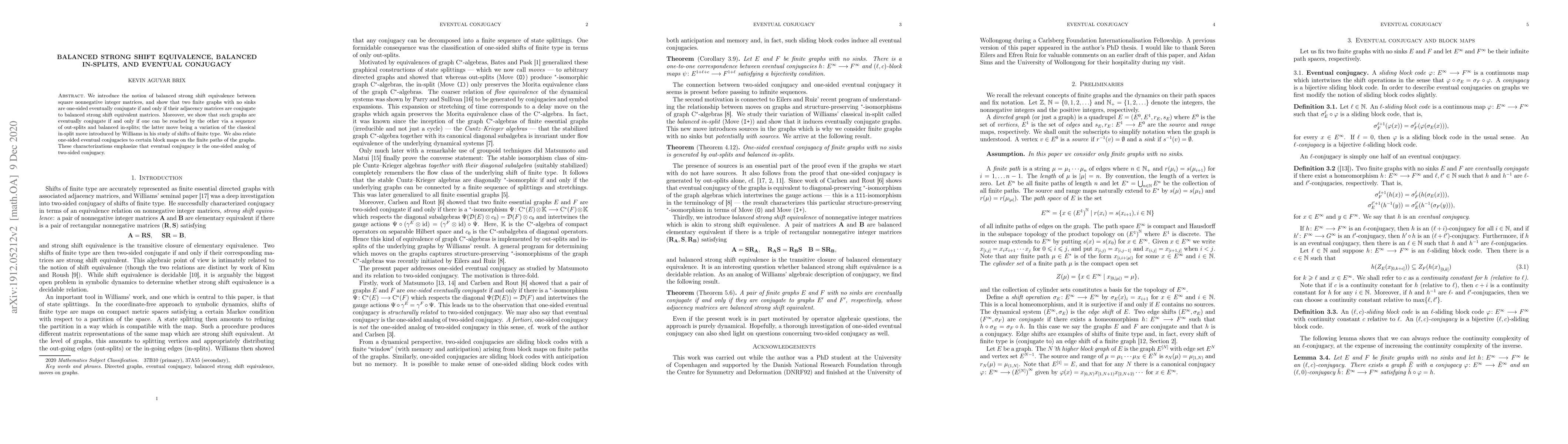 We introduce the notion of balanced strong shift equivalence between square nonnegative integer matrices, and show that two finite graphs with no sinks are one-sided eventually conjugate if and only if their adjacency matrices are conjugate to balanced strong shift equivalent matrices. Moreover, we show that such graphs are eventually conjugate if and only if one can be reached by the other via a sequence of out-splits and balanced in-splits; the latter move being a variation of the classical in-split move introduced by Williams in his study of shifts of finite type. We also relate one-sided eventual conjugacies to certain block maps on the finite paths of the graphs. These characterizations emphasize that eventual conjugacy is the one-sided analog of two-sided conjugacy.