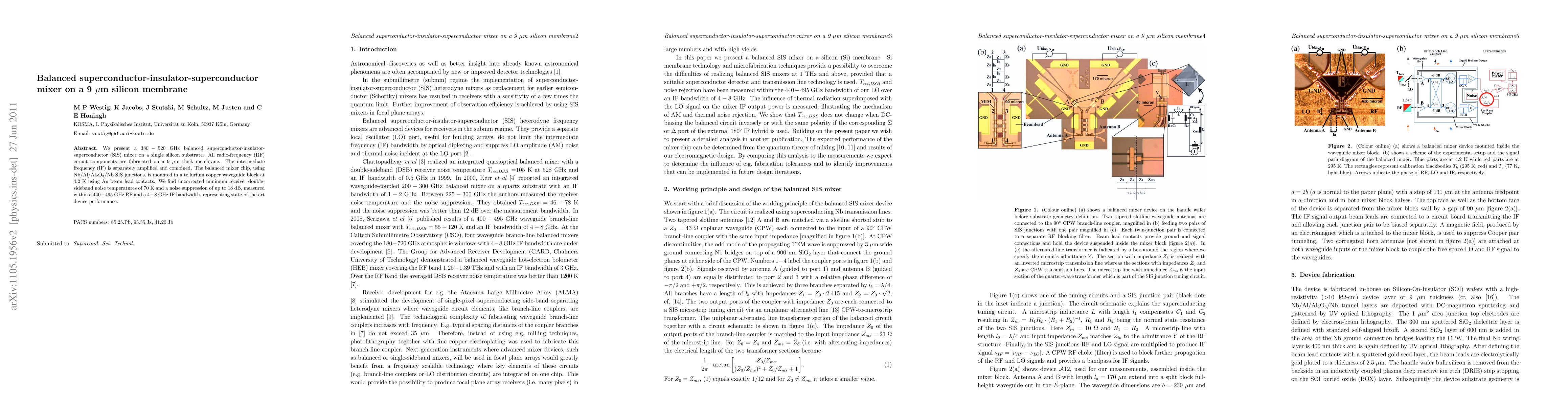 This paper presents a state-of-the-art 380-520 GHz balanced SIS mixer fabricated on a 9 µm silicon membrane, achieving low noise temperatures of 70 K and up to 18 dB noise suppression, demonstrating advanced performance in RF applications.
