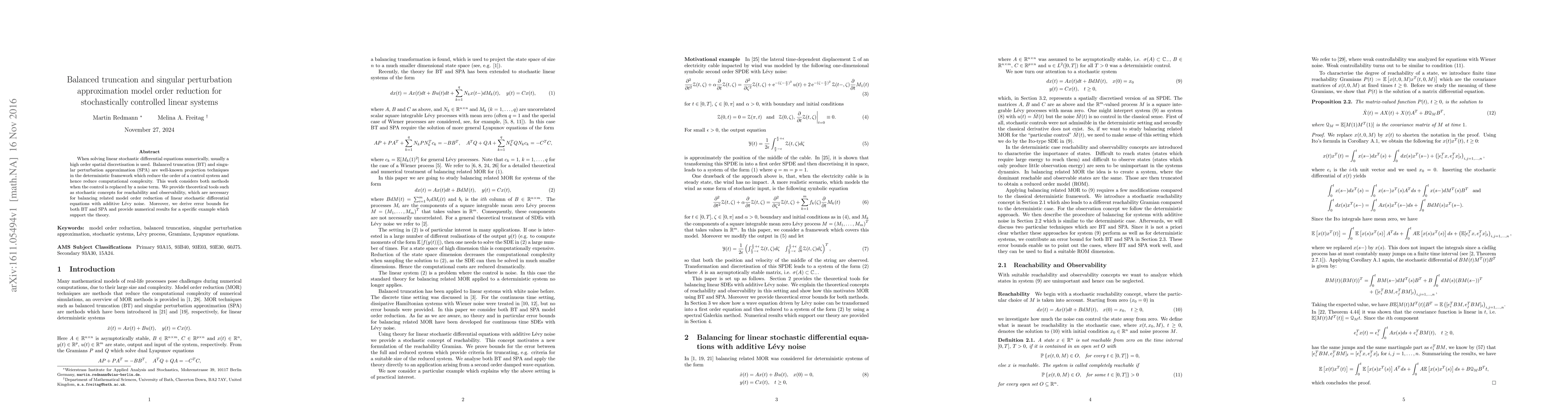 This paper explores the application of balanced truncation and singular perturbation approximation for model order reduction in stochastically controlled linear systems, providing theoretical tools for stochastic reachability and observability and deriving error bounds for both methods. Numerical results support the theoretical findings.