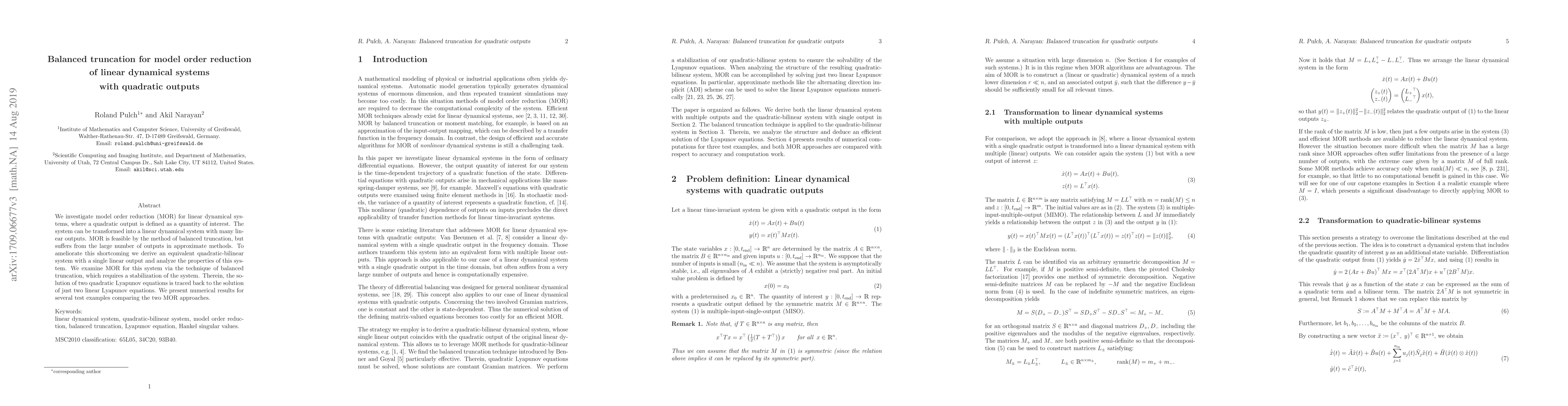 This paper explores model order reduction (MOR) for linear dynamical systems with quadratic outputs using balanced truncation. It transforms the system into an equivalent quadratic-bilinear form with a single linear output, simplifying the MOR process, and demonstrates numerical comparisons between the traditional and the new methods.