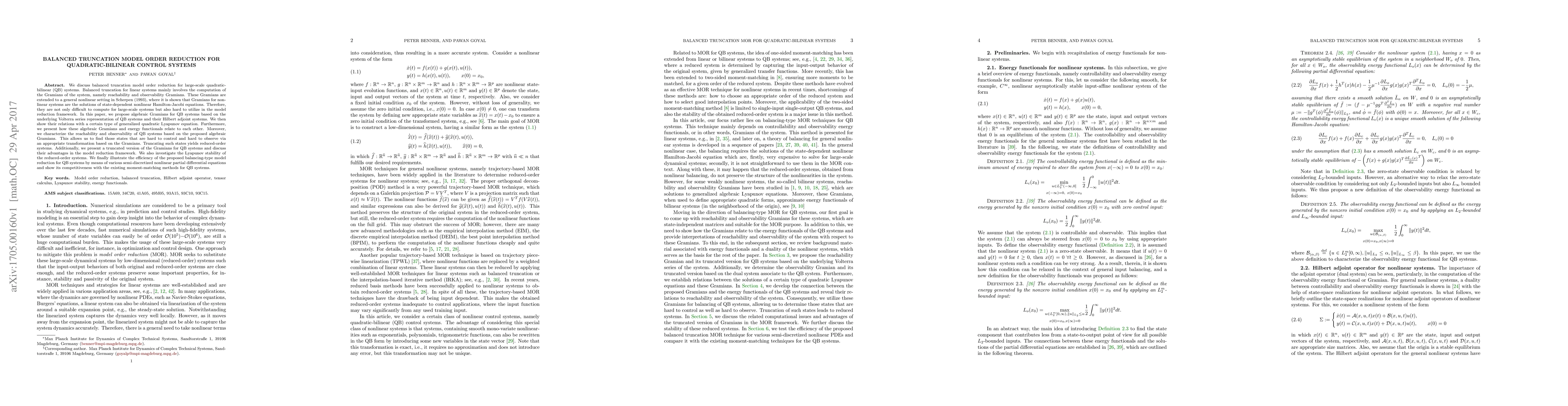 This paper proposes a balanced truncation method for model order reduction of large-scale quadratic-bilinear systems, introducing algebraic Gramians based on Volterra series and their Hilbert adjoints. The method identifies hard-to-control and observe states, enabling effective reduction while maintaining Lyapunov stability.
