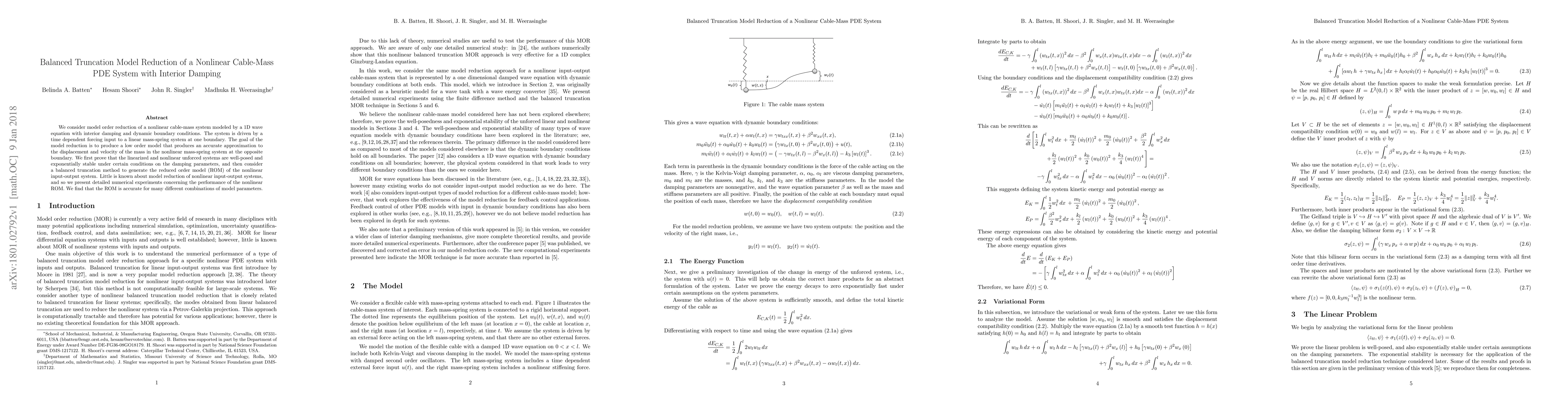 We consider model order reduction of a nonlinear cable-mass system modeled by a 1D wave equation with interior damping and dynamic boundary conditions. The system is driven by a time dependent forcing input to a linear mass-spring system at one boundary. The goal of the model reduction is to produce a low order model that produces an accurate approximation to the displacement and velocity of the mass in the nonlinear mass-spring system at the opposite boundary. We first prove that the linearized and nonlinear unforced systems are well-posed and exponentially stable under certain conditions on the damping parameters, and then consider a balanced truncation method to generate the reduced order model (ROM) of the nonlinear input-output system. Little is known about model reduction of nonlinear input-output systems, and so we present detailed numerical experiments concerning the performance of the nonlinear ROM. We find that the ROM is accurate for many different combinations of model parameters.