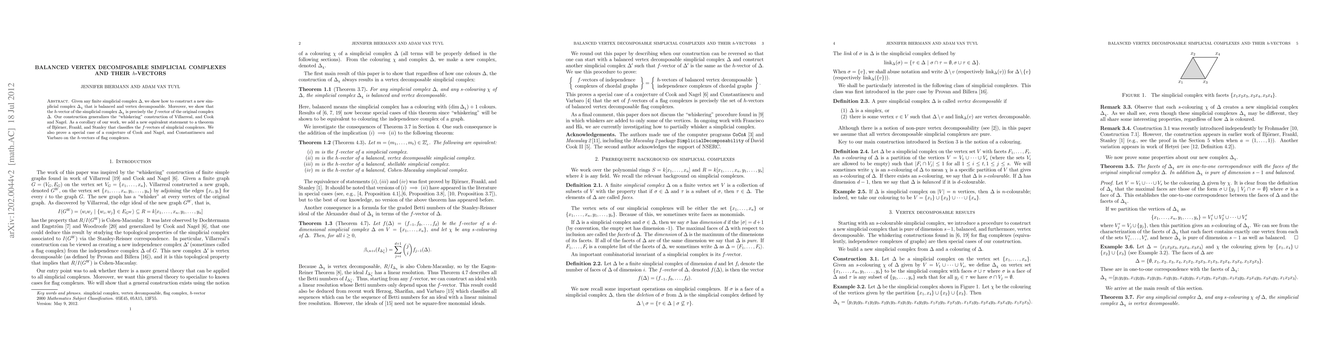Given any finite simplicial complex \Delta, we show how to construct a new simplicial complex \Delta_{\chi} that is balanced and vertex decomposable. Moreover, we show that the h-vector of the simplicial complex \Delta_{\chi} is precisely the f-vector, denoted f(\Delta), of the original complex \Delta. We deduce this result by relating f(\Delta) with the graded Betti numbers of the Alexander dual of \Delta_{\chi}. Our construction generalizes the "whiskering" construction of Villarreal, and Cook and Nagel. As a corollary of our work, we add a new equivalent statement to a theorem of Bj\"orner, Frankl, and Stanley that classifies the f-vectors of simplicial complexes. We also prove a special case of a conjecture of Cook and Nagel, and Constantinescu and Varbaro on the h-vectors of flag complexes.