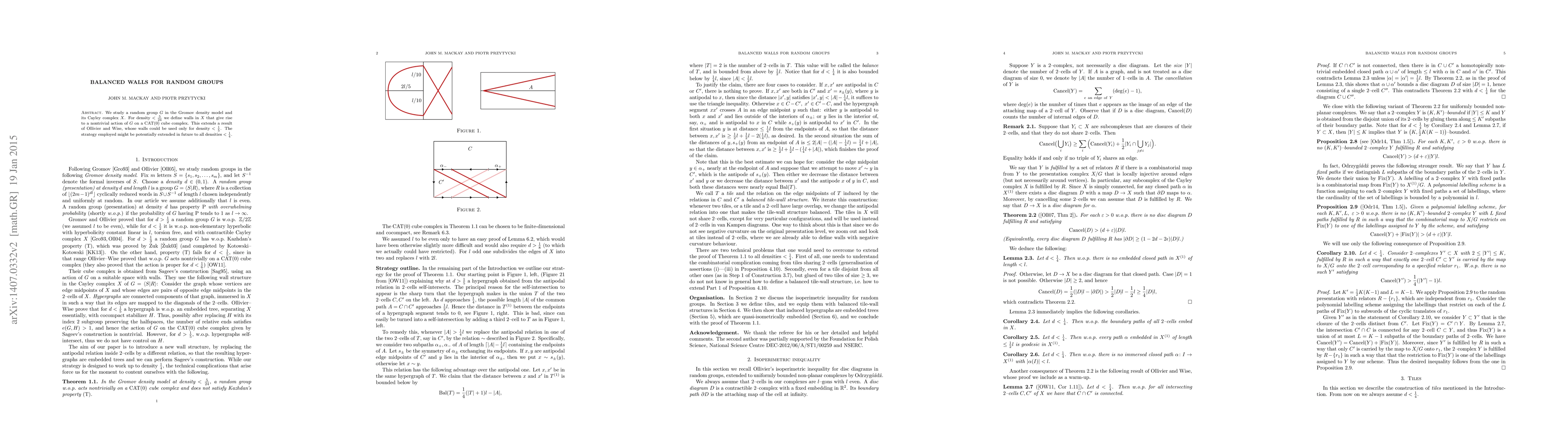 We study a random group G in the Gromov density model and its Cayley complex X. For density < 5/24 we define walls in X that give rise to a nontrivial action of G on a CAT(0) cube complex. This extends a result of Ollivier and Wise, whose walls could be used only for density < 1/5. The strategy employed might be potentially extended in future to all densities < 1/4.
