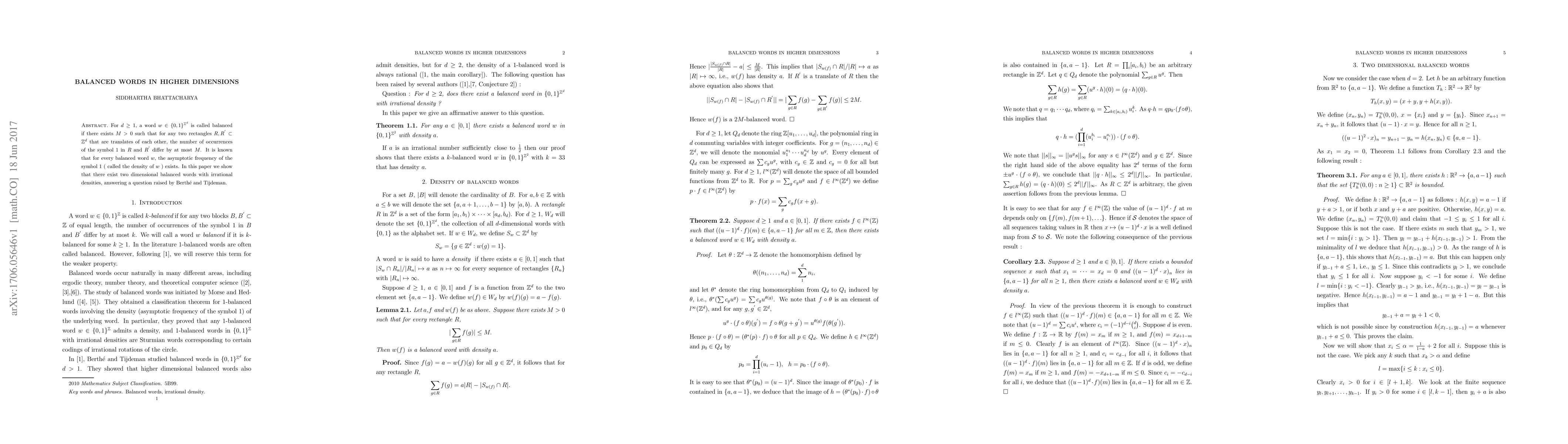 For $d\ge 1$, a word $w\in \{ 0,1\}^{\Z^d}$ is called balanced if there exists $M > 0$ such that for any two rectangles $R, R^{'}\subset\Z^d$ that are translates of each other, the number of occurrences of the symbol $1$ in $R$ and $R^{'}$ differ by at most $M$. It is known that for every balanced word $w$, the asymptotic frequency of the symbol $1$ ( called the density of $w$ ) exists. In this paper we show that there exist two dimensional balanced words with irrational densities, answering a question raised by Berth\'e and Tijdeman.