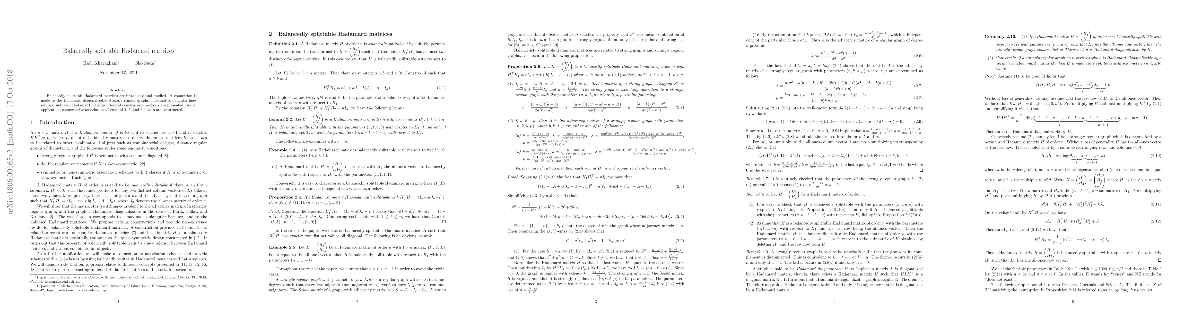 This paper introduces balancedly splittable Hadamard matrices and explores their connections to Hadamard diagonalizable strongly regular graphs, maximal equiangular line sets, and unbiased Hadamard matrices. It presents several construction methods and applies them to construct commutative association schemes with 4, 5, and 6 classes.