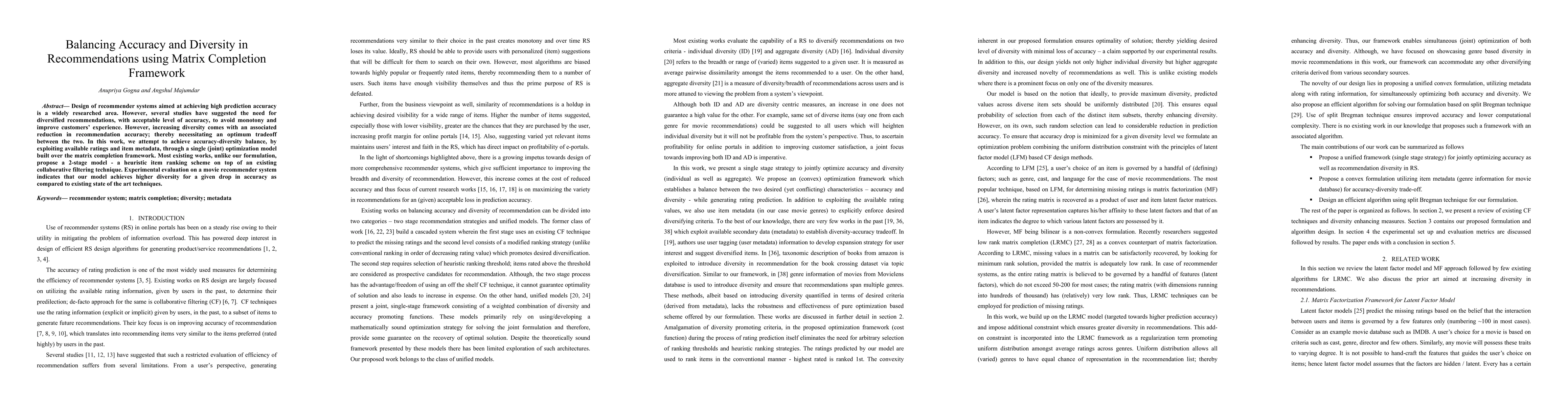 This paper proposes a joint optimization model within a matrix completion framework to balance recommendation accuracy and diversity. Unlike two-stage models, this approach integrates both aspects in a single model, achieving higher diversity with a minimal drop in accuracy, as demonstrated in a movie recommender system.