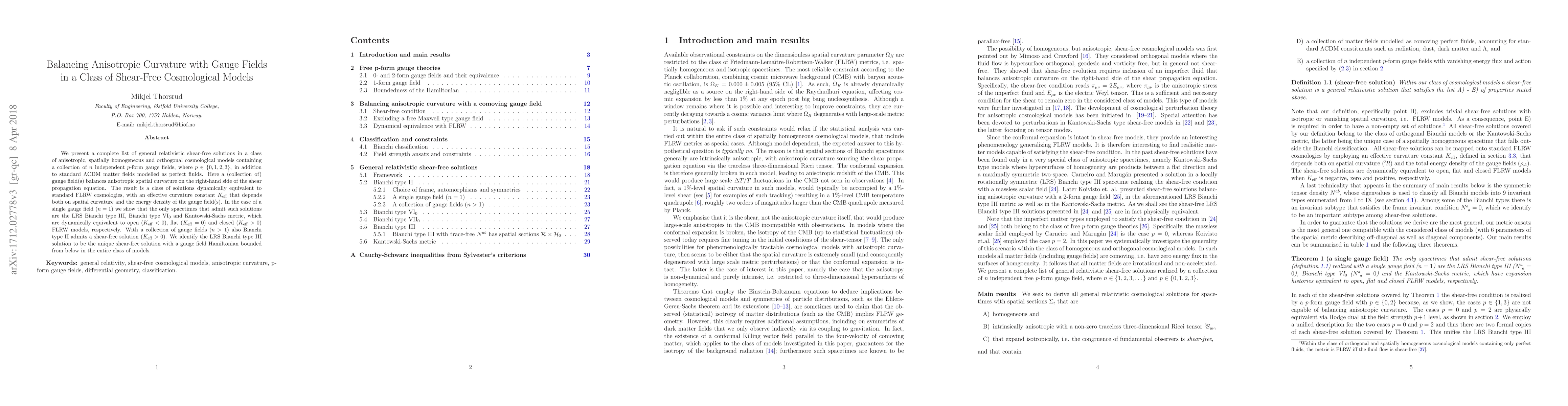 We present a complete list of general relativistic shear-free solutions in a class of anisotropic, spatially homogeneous and orthogonal cosmological models containing a collection of $n$ independent $p$-form gauge fields, where $p\in\{0,1,2,3\}$, in addition to standard $\Lambda$CDM matter fields modelled as perfect fluids. Here a (collection of) gauge field(s) balances anisotropic spatial curvature on the right-hand side of the shear propagation equation. The result is a class of solutions dynamically equivalent to standard FLRW cosmologies, with an effective curvature constant $K_{\rm{eff}}$ that depends both on spatial curvature and the energy density of the gauge field(s). In the case of a single gauge field ($n=1$) we show that the only spacetimes that admit such solutions are the LRS Bianchi type III, Bianchi type VI$_0$ and Kantowski-Sachs metric, which are dynamically equivalent to open ($K_{\rm{eff}}<0$), flat ($K_{\rm{eff}}=0$) and closed ($K_{\rm{eff}}>0$) FLRW models, respectively. With a collection of gauge fields ($n>1$) also Bianchi type II admits a shear-free solution ($K_{\rm{eff}}>0$). We identify the LRS Bianchi type III solution to be the unique shear-free solution with a gauge field Hamiltonian bounded from below in the entire class of models.
