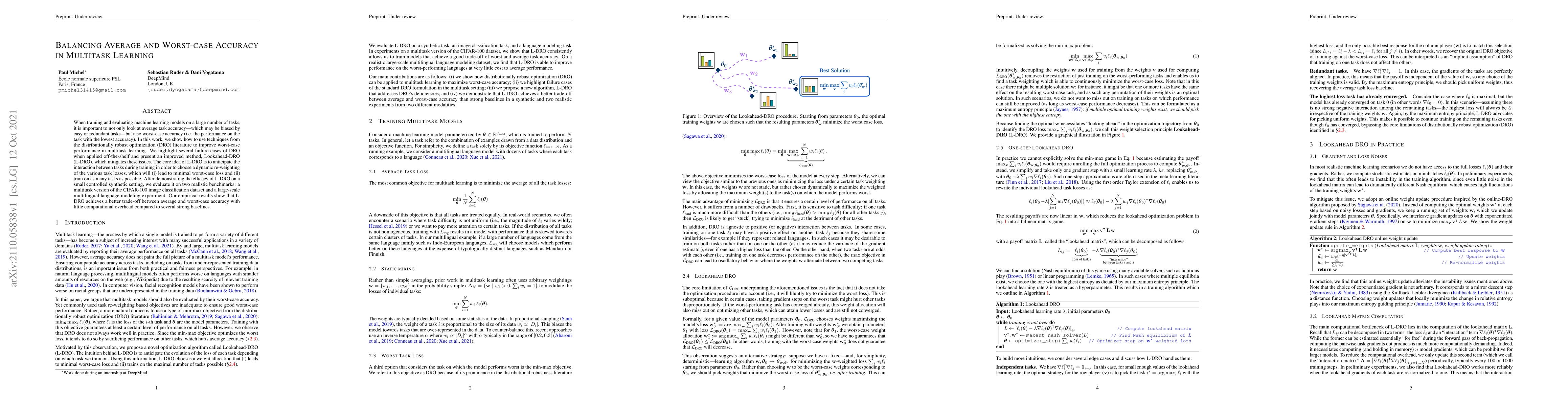 This paper proposes Lookahead-DRO (L-DRO), a method for multitask learning that balances average and worst-case accuracy by dynamically re-weighting task losses to minimize worst-case loss while maintaining performance on most tasks. Empirical results on CIFAR-100 and multilingual language modeling show L-DRO achieves better trade-offs with minimal additional computational cost.