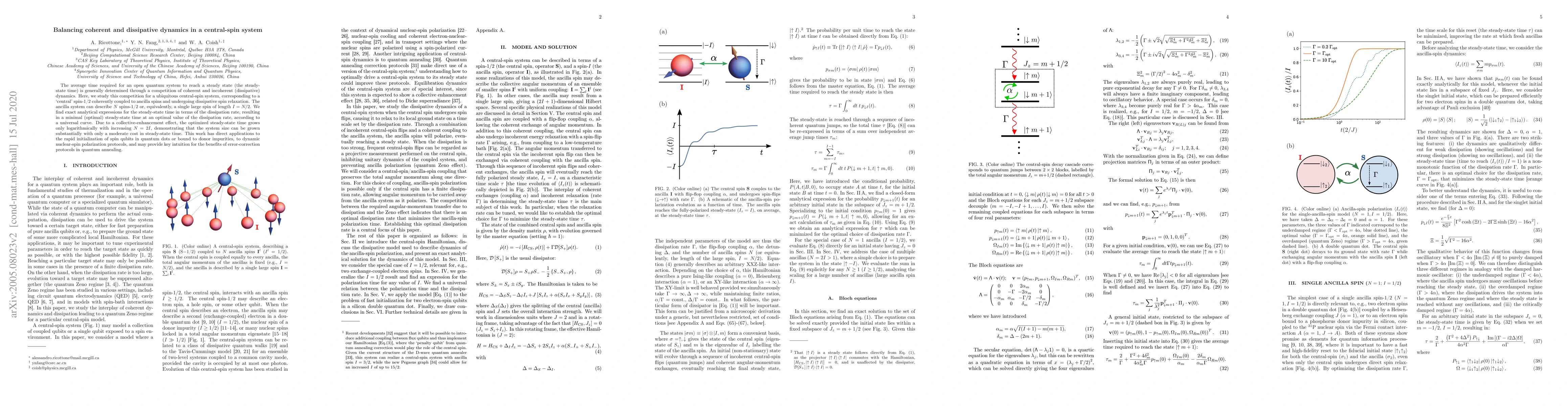 This paper investigates the interplay between coherent and dissipative dynamics in a central-spin system, deriving analytical expressions for the steady-state time. It reveals an optimal dissipation rate that minimizes this time, showing that the system size can grow logarithmically without significant increases in steady-state time, with implications for quantum dot initialization and nuclear-spin polarization.