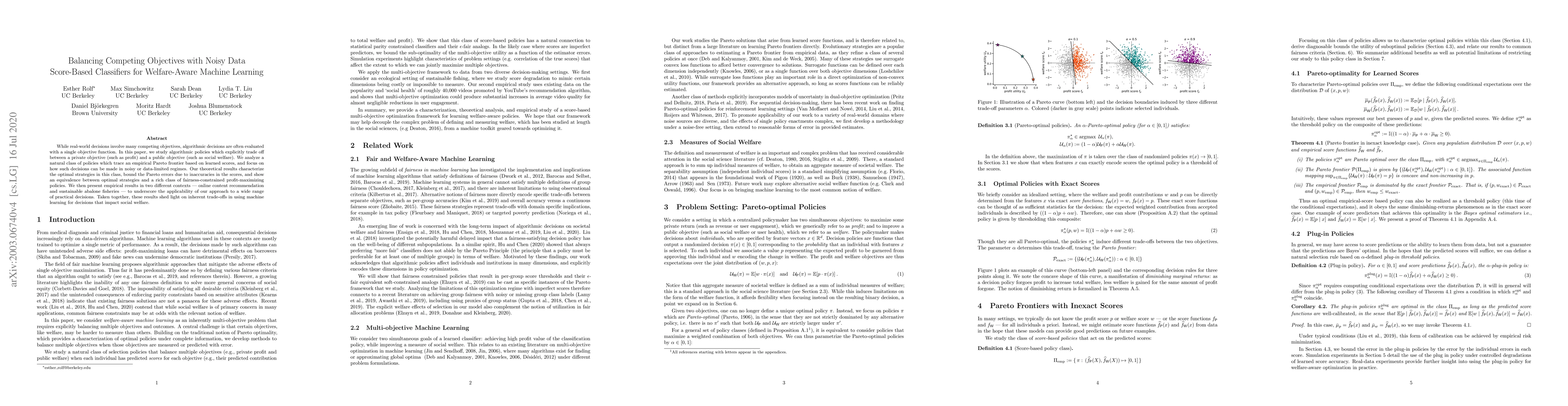 While real-world decisions involve many competing objectives, algorithmic decisions are often evaluated with a single objective function. In this paper, we study algorithmic policies which explicitly trade off between a private objective (such as profit) and a public objective (such as social welfare). We analyze a natural class of policies which trace an empirical Pareto frontier based on learned scores, and focus on how such decisions can be made in noisy or data-limited regimes. Our theoretical results characterize the optimal strategies in this class, bound the Pareto errors due to inaccuracies in the scores, and show an equivalence between optimal strategies and a rich class of fairness-constrained profit-maximizing policies. We then present empirical results in two different contexts -- online content recommendation and sustainable abalone fisheries -- to underscore the applicability of our approach to a wide range of practical decisions. Taken together, these results shed light on inherent trade-offs in using machine learning for decisions that impact social welfare.
