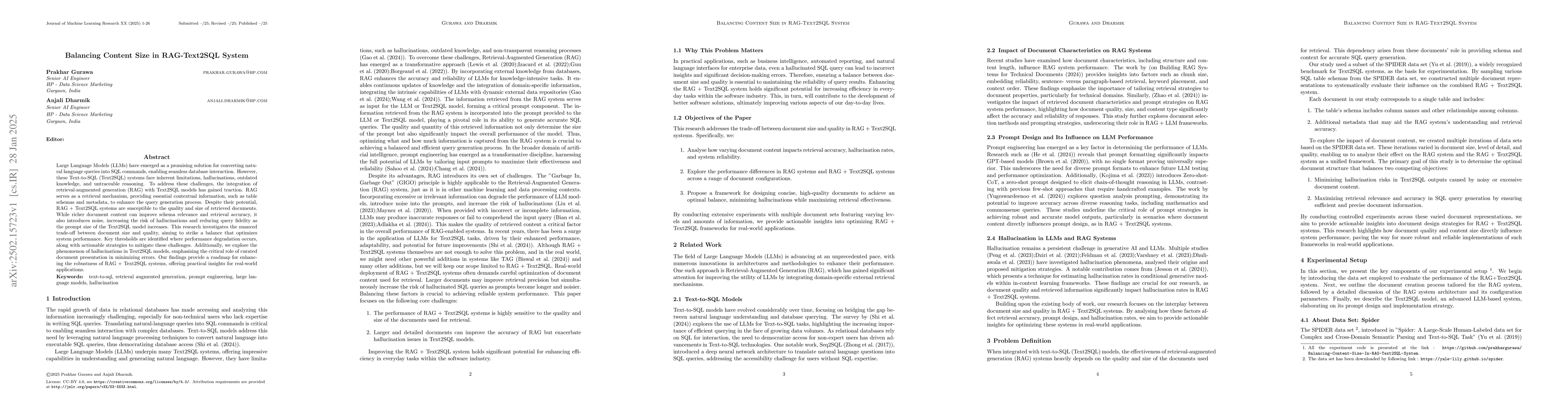 Large Language Models (LLMs) have emerged as a promising solution for converting natural language queries into SQL commands, enabling seamless database interaction. However, these Text-to-SQL (Text2SQL) systems face inherent limitations, hallucinations, outdated knowledge, and untraceable reasoning. To address these challenges, the integration of retrieval-augmented generation (RAG) with Text2SQL models has gained traction. RAG serves as a retrieval mechanism, providing essential contextual information, such as table schemas and metadata, to enhance the query generation process. Despite their potential, RAG + Text2SQL systems are susceptible to the quality and size of retrieved documents. While richer document content can improve schema relevance and retrieval accuracy, it also introduces noise, increasing the risk of hallucinations and reducing query fidelity as the prompt size of the Text2SQL model increases. This research investigates the nuanced trade-off between document size and quality, aiming to strike a balance that optimizes system performance. Key thresholds are identified where performance degradation occurs, along with actionable strategies to mitigate these challenges. Additionally, we explore the phenomenon of hallucinations in Text2SQL models, emphasizing the critical role of curated document presentation in minimizing errors. Our findings provide a roadmap for enhancing the robustness of RAG + Text2SQL systems, offering practical insights for real-world applications.