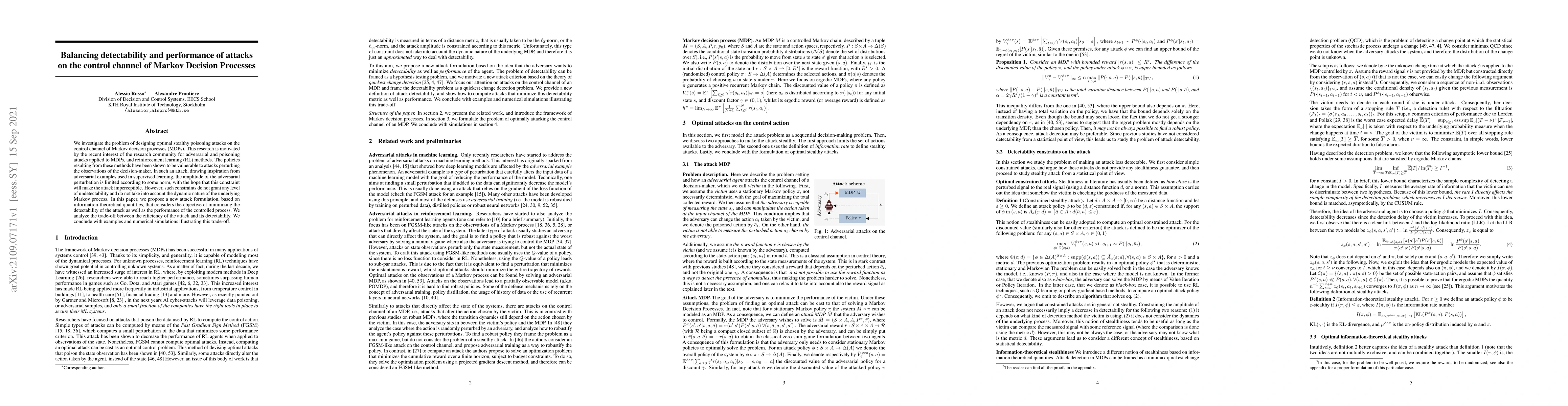 We investigate the problem of designing optimal stealthy poisoning attacks on the control channel of Markov decision processes (MDPs). This research is motivated by the recent interest of the research community for adversarial and poisoning attacks applied to MDPs, and reinforcement learning (RL) methods. The policies resulting from these methods have been shown to be vulnerable to attacks perturbing the observations of the decision-maker. In such an attack, drawing inspiration from adversarial examples used in supervised learning, the amplitude of the adversarial perturbation is limited according to some norm, with the hope that this constraint will make the attack imperceptible. However, such constraints do not grant any level of undetectability and do not take into account the dynamic nature of the underlying Markov process. In this paper, we propose a new attack formulation, based on information-theoretical quantities, that considers the objective of minimizing the detectability of the attack as well as the performance of the controlled process. We analyze the trade-off between the efficiency of the attack and its detectability. We conclude with examples and numerical simulations illustrating this trade-off.