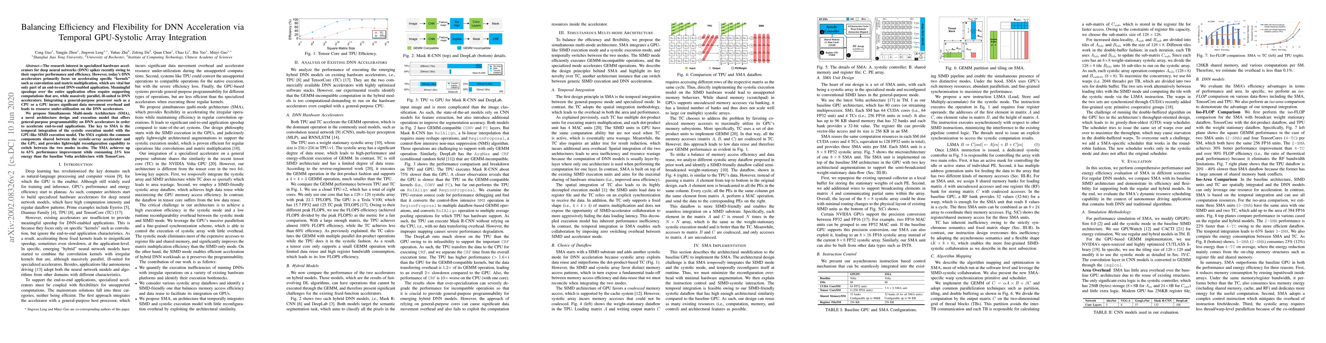 This paper proposes the Simultaneous Multi-mode Architecture (SMA) to balance efficiency and flexibility for deep neural network (DNN) acceleration by integrating a temporal GPU-systolic array. The SMA achieves up to 63% performance improvement and 23% less energy consumption compared to the baseline Volta architecture with TensorCore.
