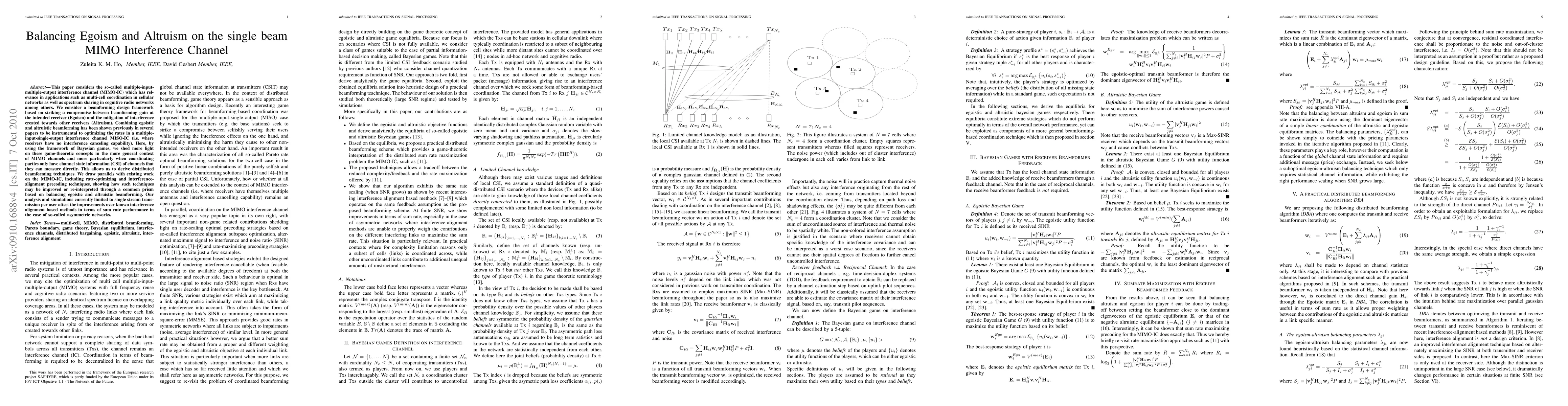 This paper considers the so-called multiple-input-multiple-output interference channel (MIMO-IC) which has relevance in applications such as multi-cell coordination in cellular networks as well as spectrum sharing in cognitive radio networks among others. We consider a beamforming design framework based on striking a compromise between beamforming gain at the intended receiver (Egoism) and the mitigation of interference created towards other receivers (Altruism). Combining egoistic and altruistic beamforming has been shown previously in several papers to be instrumental to optimizing the rates in a multiple-input-single-output interference channel MISO-IC (i.e. where receivers have no interference canceling capability). Here, by using the framework of Bayesian games, we shed more light on these game-theoretic concepts in the more general context of MIMO channels and more particularly when coordinating parties only have channel state information (CSI) of channels that they can measure directly. This allows us to derive distributed beamforming techniques. We draw parallels with existing work on the MIMO-IC, including rate-optimizing and interference-alignment precoding techniques, showing how such techniques may be improved or re-interpreted through a common prism based on balancing egoistic and altruistic beamforming. Our analysis and simulations currently limited to single stream transmission per user attest the improvements over known interference alignment based methods in terms of sum rate performance in the case of so-called asymmetric networks.