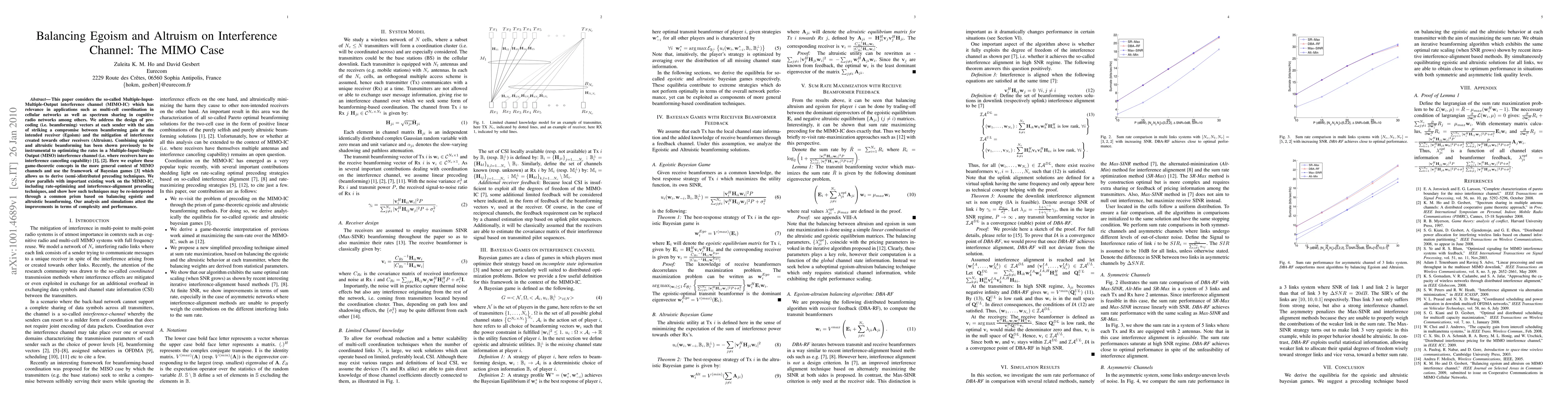 This paper considers the so-called MIMO interference channel. This situation has relevance in applications such as multi-cell coordination in cellular networks as well as spectrum sharing in cognitive radio networks among others. We address the design of precoding (i.e. beamforming) vectors at each sender with the aim of striking a compromise between beamforming gain at the intended receiver (Egoism) and the mitigation of interference created towards other receivers (Altruism). Combining egoistic and altruistic beamforming has been shown previously to be instrumental to optimizing the rates in a MISO interference channel (i.e. where receivers have no interference canceling capability) . Here we explore these game-theoretic concepts in the more general context of MIMO channels and using the framework of Bayesian games, allowing us to derive (semi-)distributed precoding techniques. We draw parallels with existing work on the MIMO interference channel, including rate-optimizing and interference-alignement precoding techniques, showing how such techniques may be improved and re-interpretated through a common prism based on balancing egoistic and altruistic beamforming.