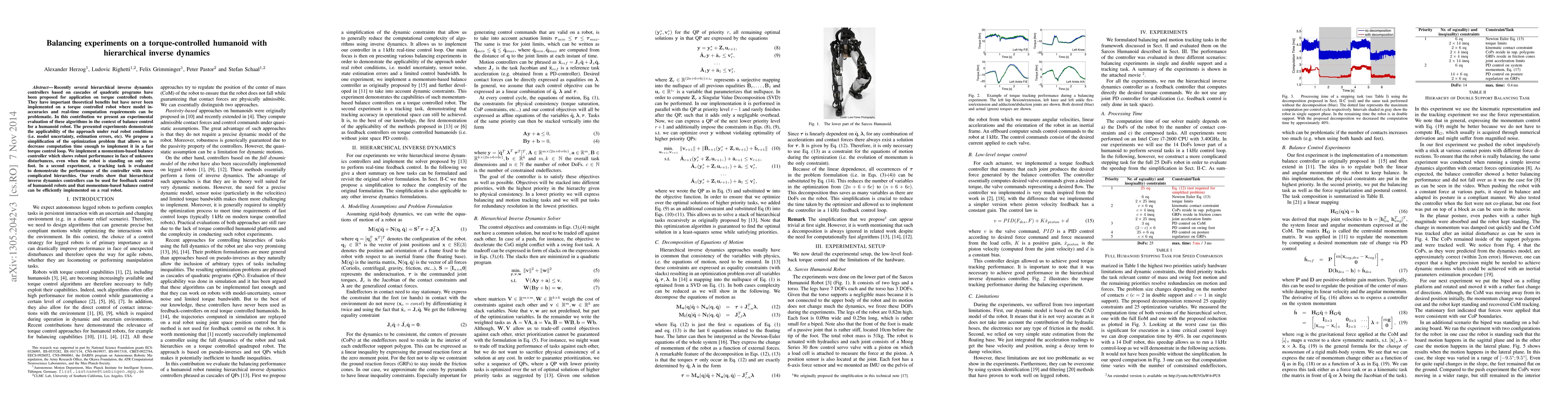 This paper evaluates hierarchical inverse dynamics controllers for balance control on a torque-controlled humanoid robot, demonstrating their robustness under real-world conditions. The authors simplify the optimization problem to meet real-time computation requirements, successfully implementing a momentum-based balance controller that performs well even with model uncertainties.