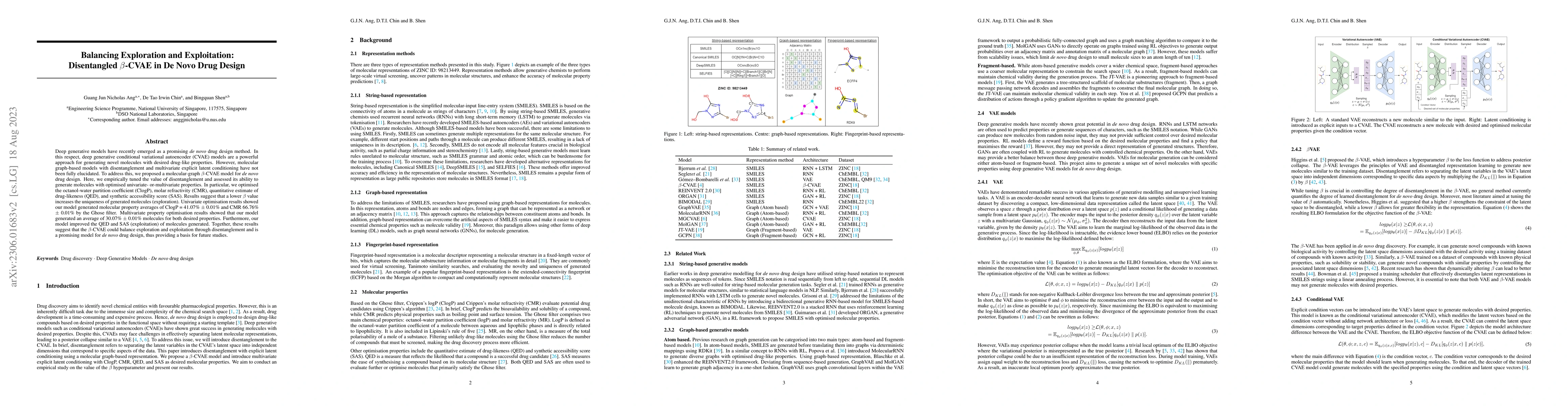 This work provides a novel approach to de novo drug design by balancing exploration and exploitation using disentangled $\beta$-CVAE, which could lead to the generation of unique molecules with optimized drug-like properties.