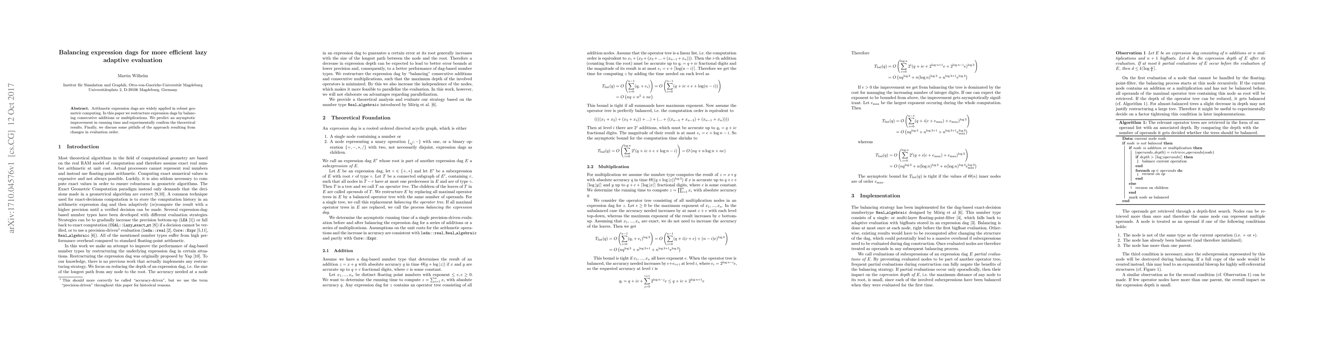 This paper proposes a method to balance arithmetic expression dags by restructuring consecutive additions or multiplications, predicting and experimentally confirming an asymptotic improvement in running time for efficient lazy adaptive evaluation in geometric computing. It also discusses potential pitfalls arising from changes in evaluation order.
